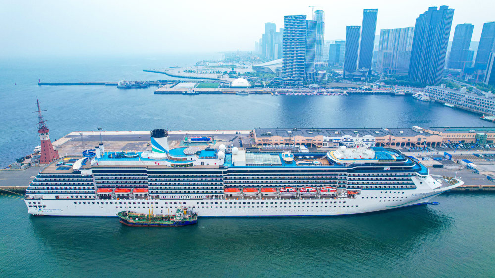 5月27日拍摄的停靠在大连港国际邮轮中心泊位的“爱达·地中海”号(无人机照片)。新华社记者 潘昱龙 摄