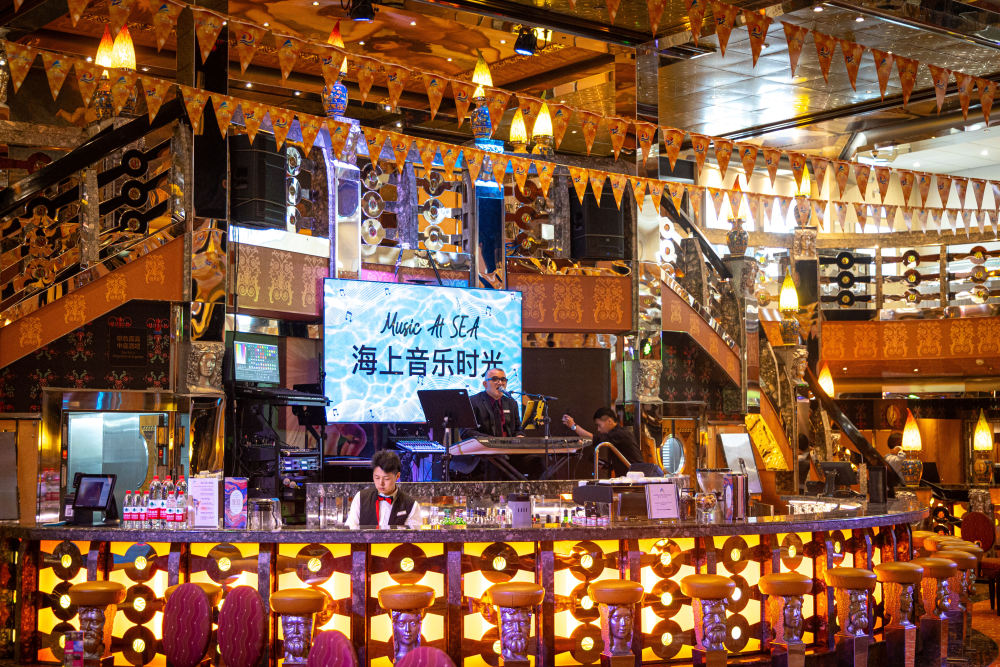 5月27日,在国际邮轮“爱达·地中海”号上,工作人员为游客演出。新华社记者 潘昱龙 摄