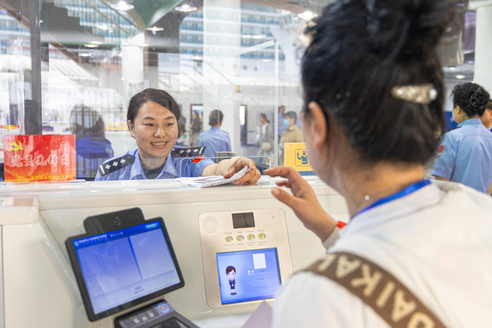 5月27日,大连港国际邮轮中心边检民警为登轮游客办理出境手续。新华社记者 潘昱龙 摄