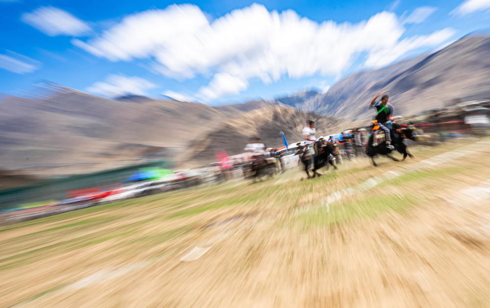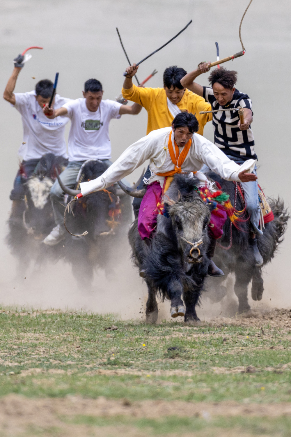 5月29日,拉萨市达孜区举办2025年首届赛牦牛比赛,132头体格健硕的牦牛在骑手驾驭下,在达孜区德庆镇桑珠林村的山沟里竞速争先,吸引众多农牧民群众前来观看。