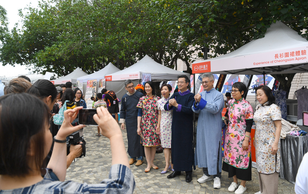 5月31日,在香港文化中心露天广场举行的“非遗嘉年华”上,人们身着旗袍长衫合影。新华社记者 陈铎 摄