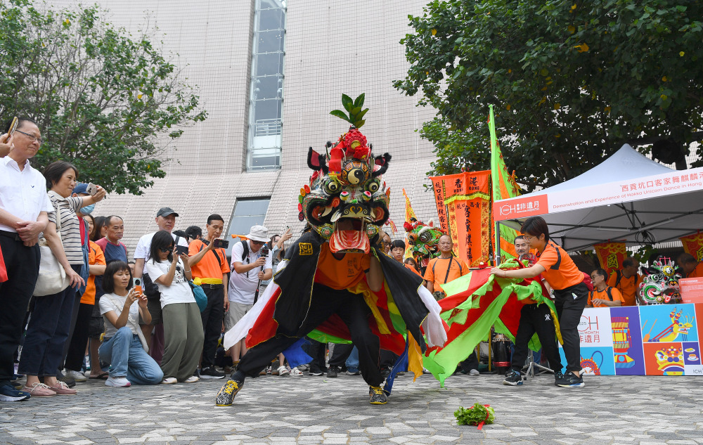 5月31日,演员在香港文化中心露天广场举行的“非遗嘉年华”上表演西贡坑口客家舞麒麟。新华社记者 陈铎 摄