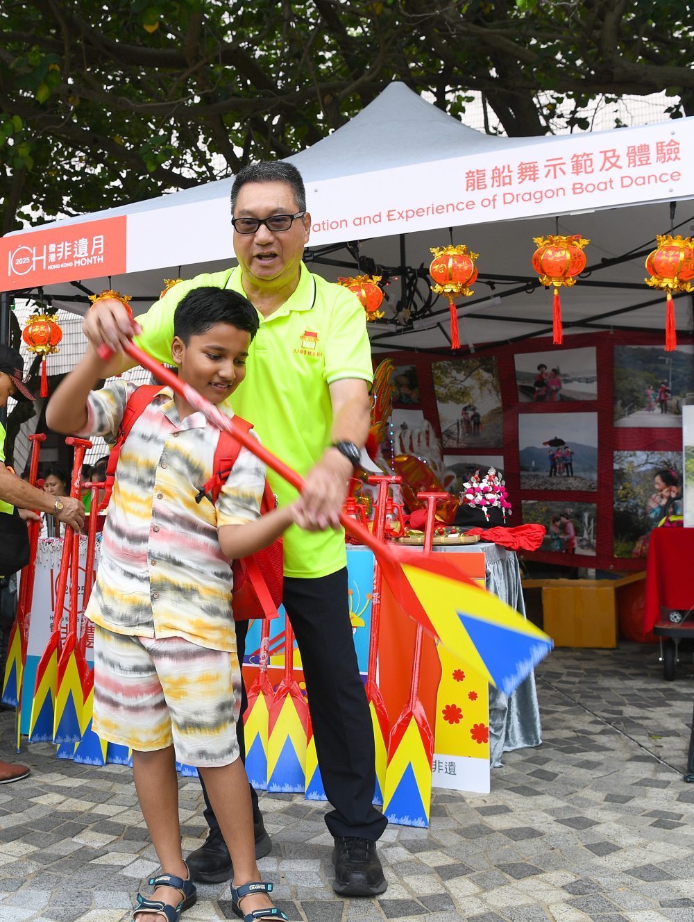 5月31日,一名男孩在香港文化中心露天广场举行的“非遗嘉年华”上体验龙船舞。新华社记者 陈铎 摄