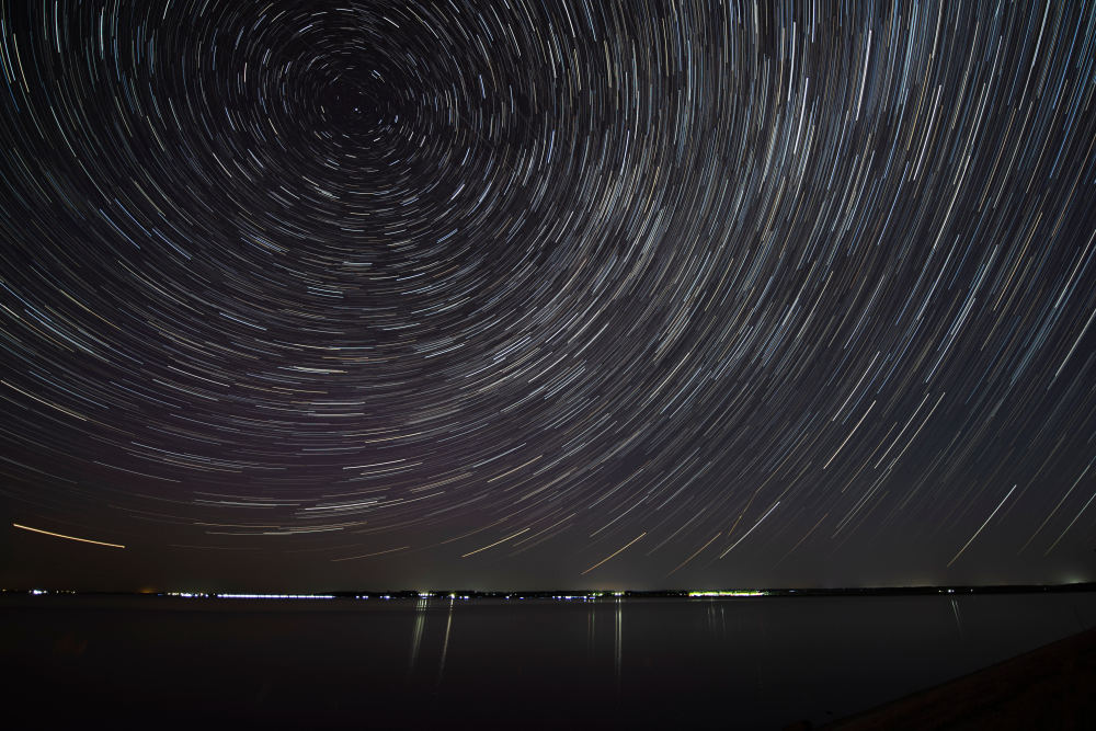 6月1日夜,黑龙江省望奎县卫星水库上空的星空(堆栈合成照片)。新华社记者 谢剑飞 摄