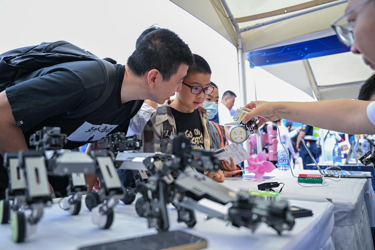 6月2日,在武汉市蔡甸区花博汇景区,游客观看桌面机器人。新华社记者 杜子璇 摄