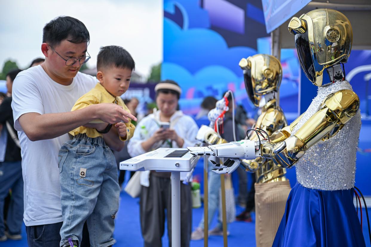6月2日,在武汉市蔡甸区花博汇景区,游客观看机器人演奏古琴。新华社记者 杜子璇 摄