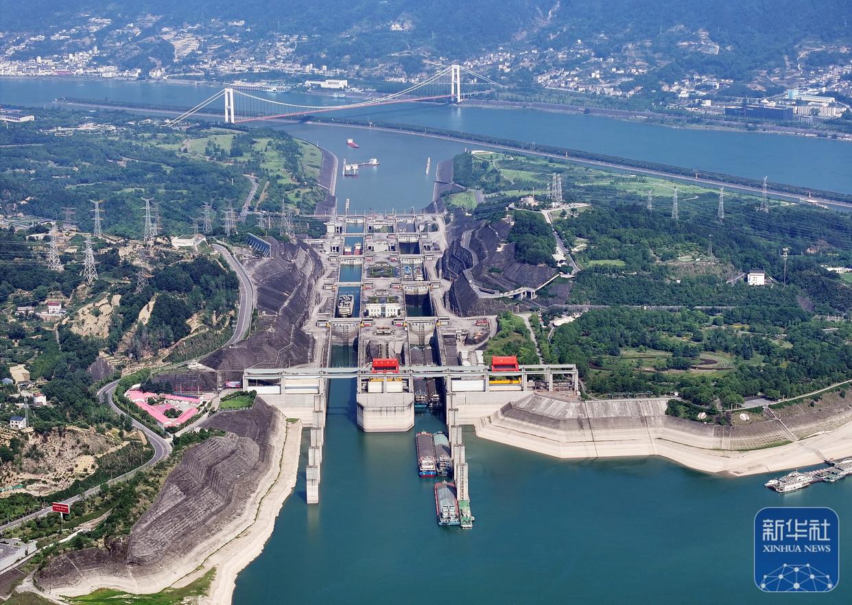 ↑ 6月13日,在湖北省宜昌市,船舶有序通过三峡双线五级船闸(无人机照片)。新华社发(王辉富 摄)