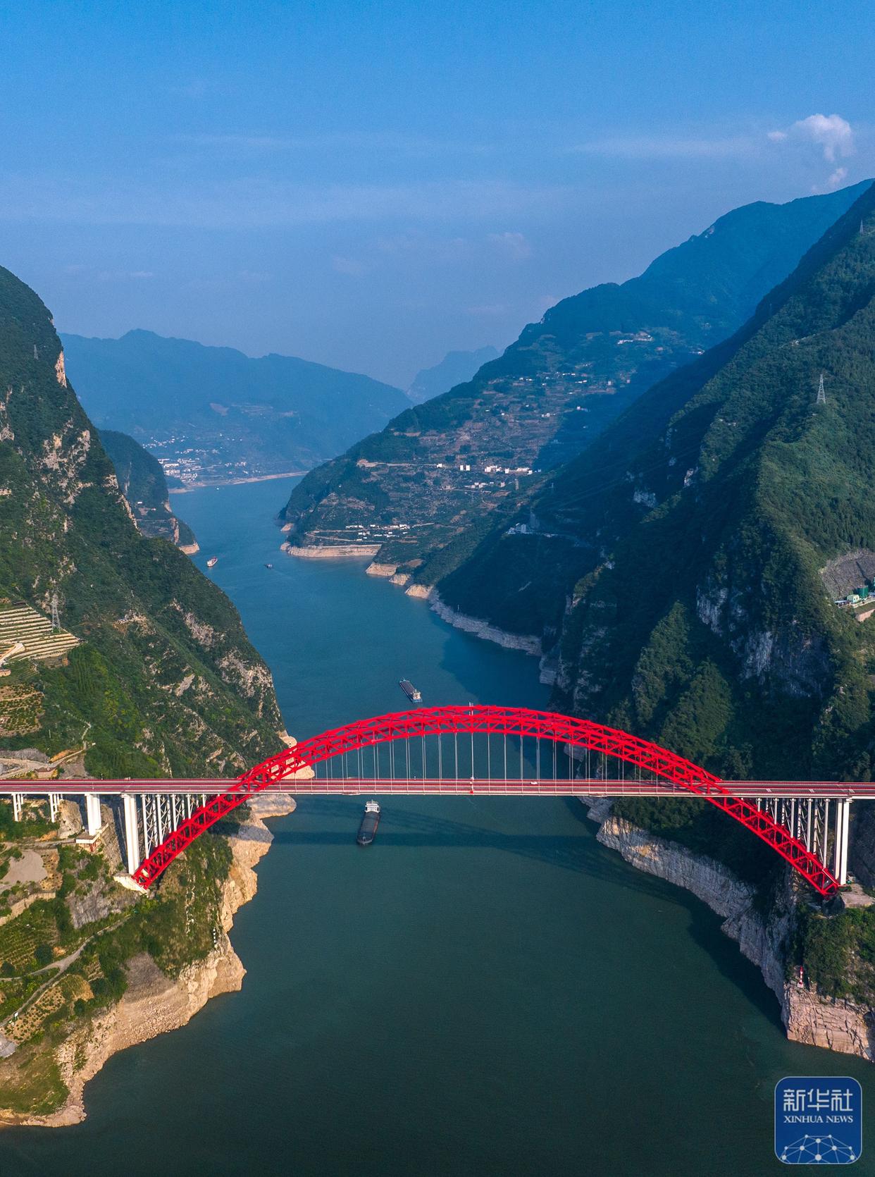 ↑ 6月13日,船舶行驶在三峡水库水位下降后的湖北省秭归县兵书宝剑峡水域(无人机照片)。新华社发(王罡 摄)