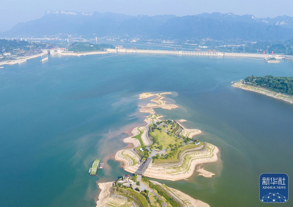 ↑ 这是6月13日拍摄的三峡大坝坝前水位下降后的消落带(无人机照片)。新华社发(郑家裕 摄)