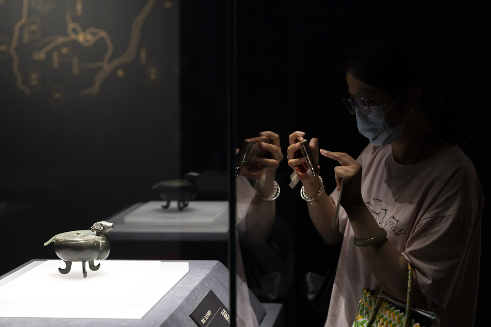 6月15日,在上海市闵行区博物馆,观众拍摄附盖三足羊形铜尊。新华社记者 王翔 摄