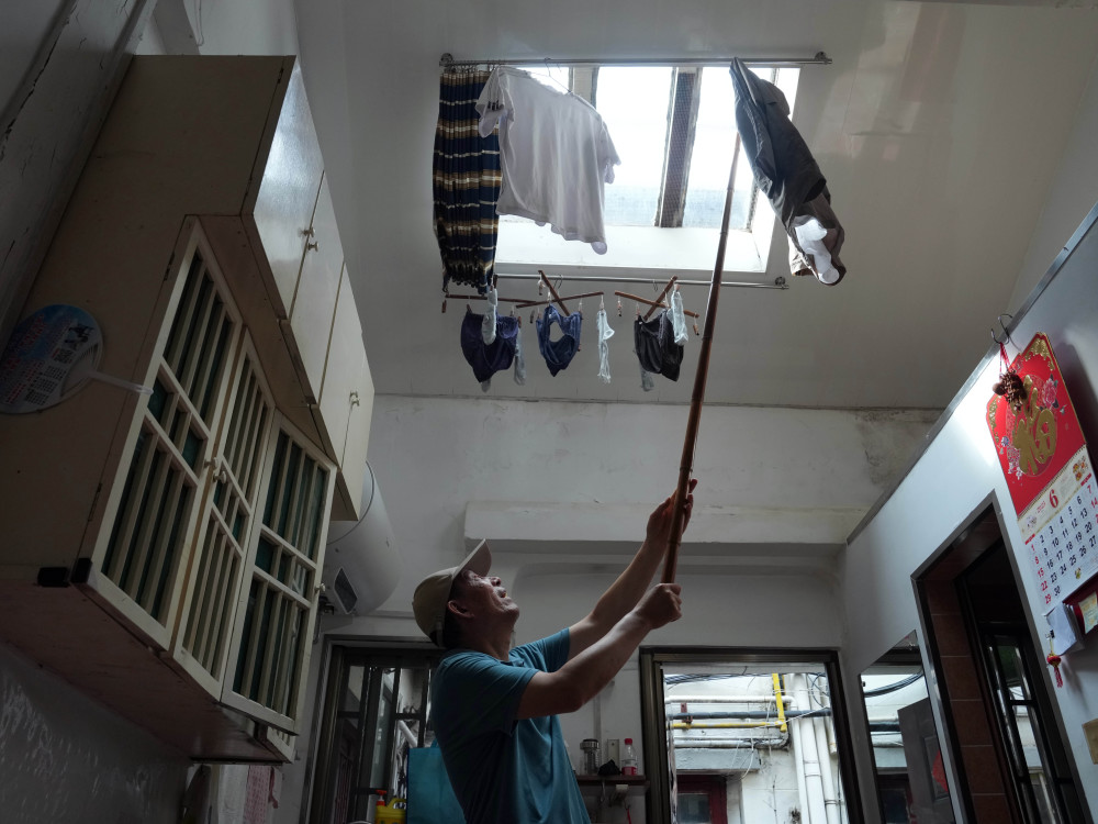 6月16日,搬迁居民韩国友在位于西康路894弄的家中收衣服。新华社记者 刘颖 摄
