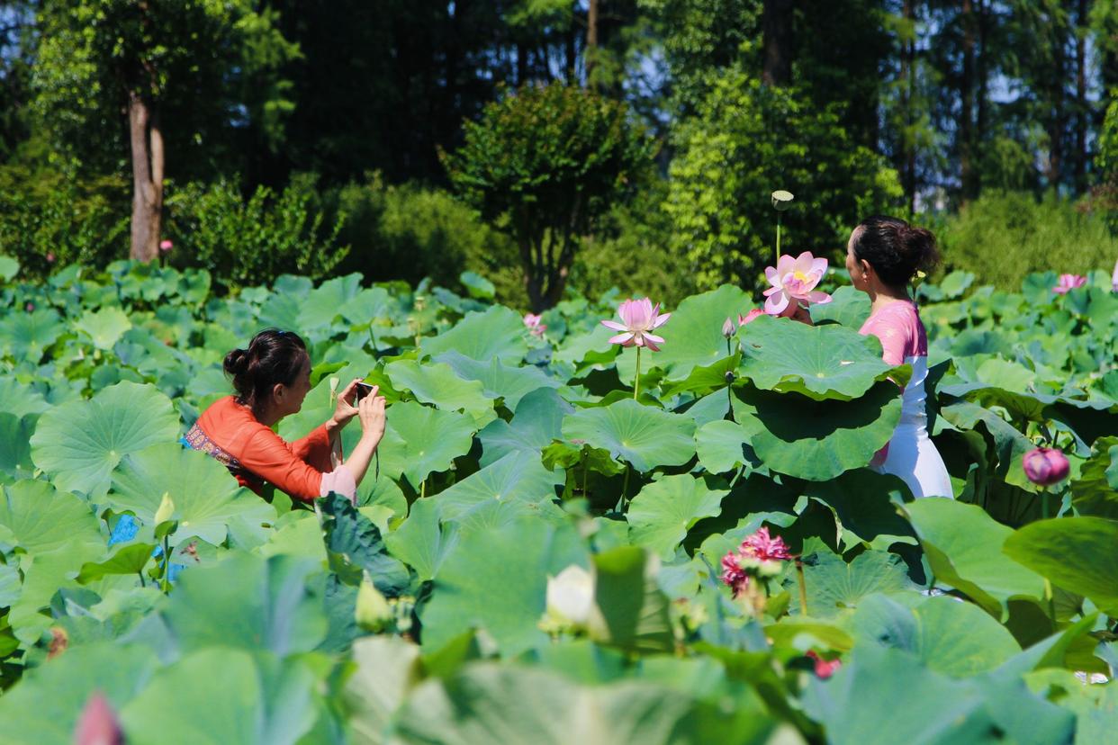 盛夏时节,游客徜徉在东湖荷园荷花池间拍照留念。