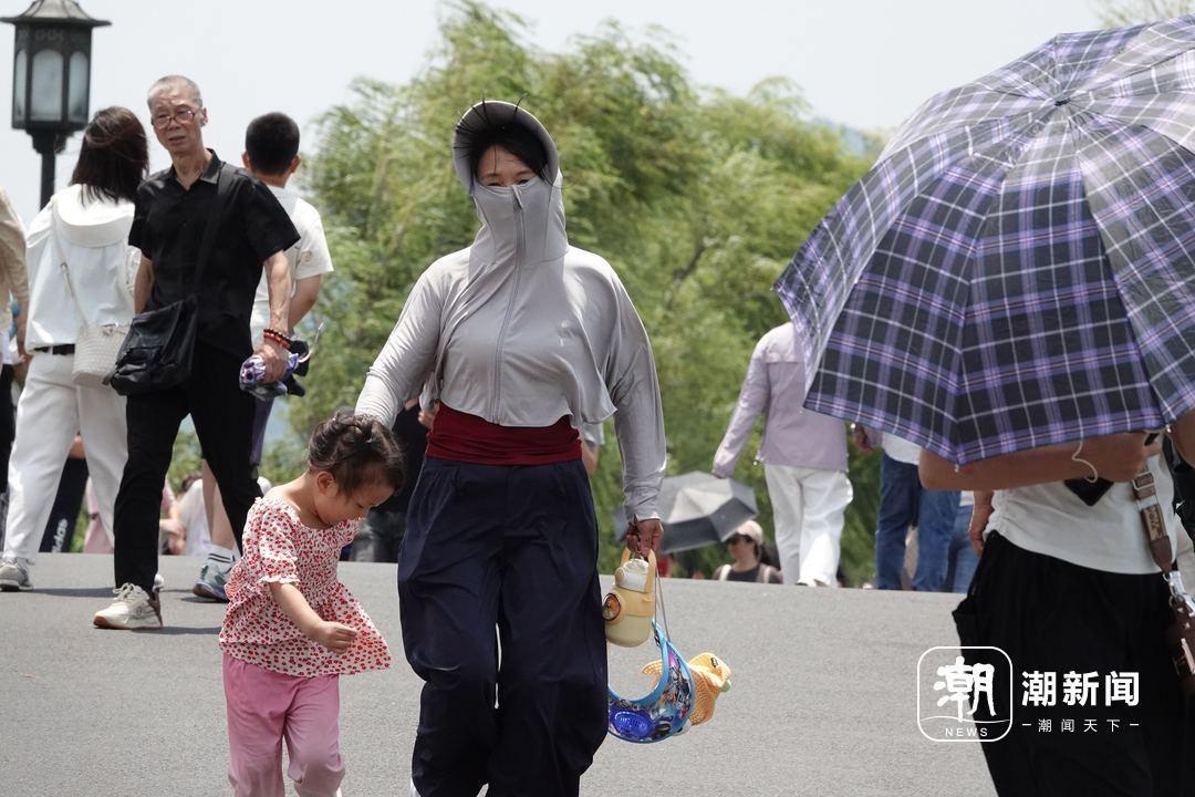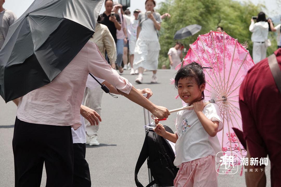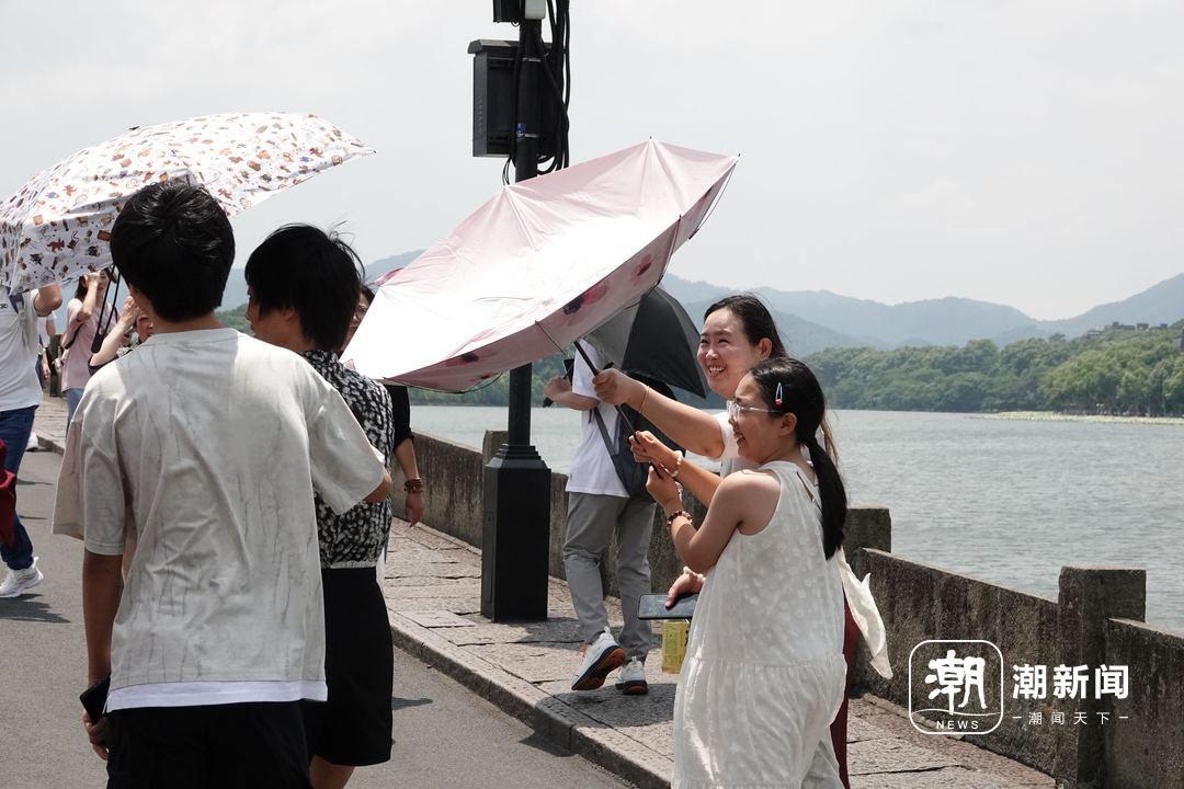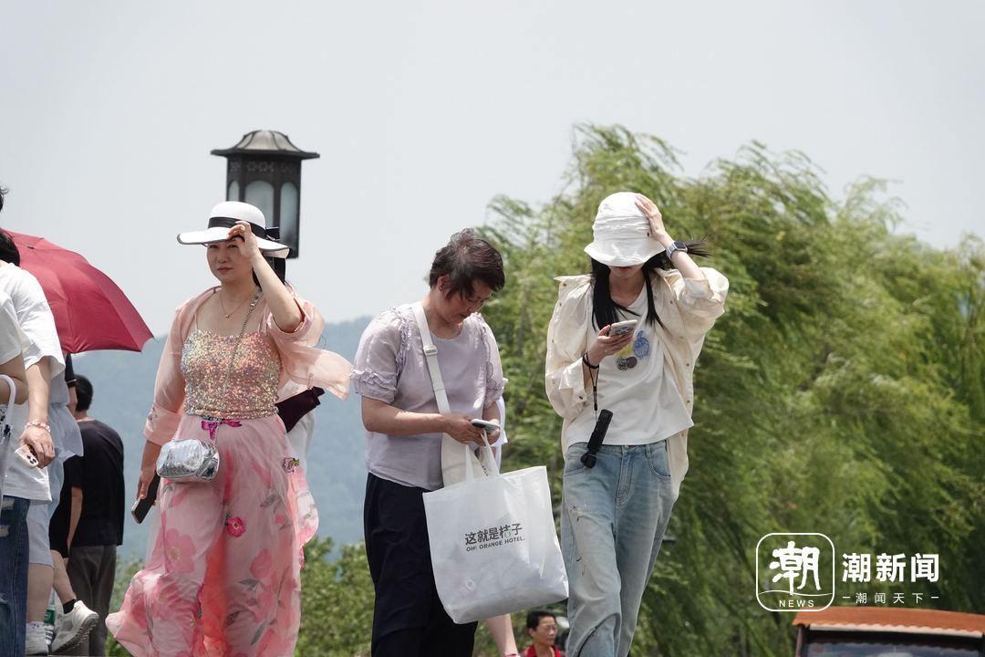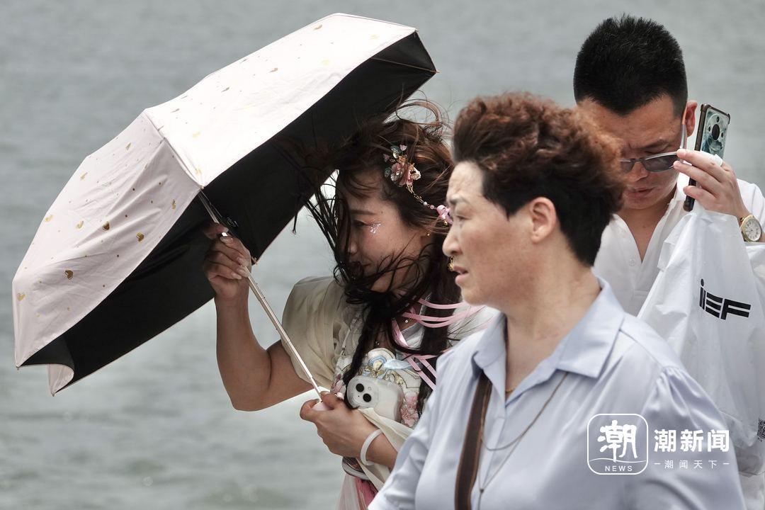 7月10日,杭州西湖景区,一阵突来的大风让游客们“艰难”前行。
