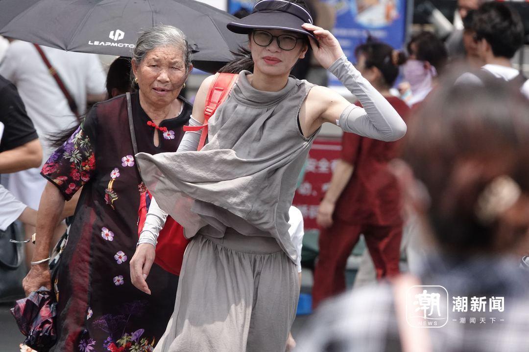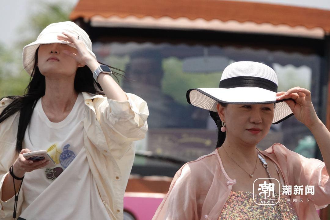 两位女士在风中抓住帽子。记者 杨晓轩 摄