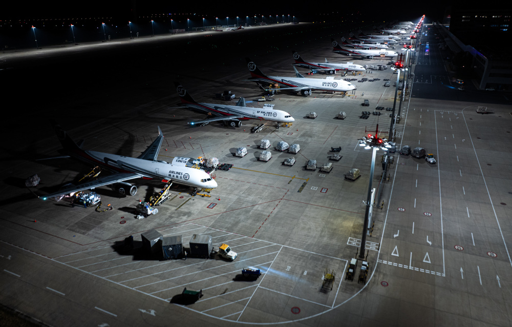 子夜时分,鄂州花湖国际机场灯火通明,几十余架货机整齐排列在停机坪上,上百名工作人员正加紧卸货。当晚,共有来自国内外的近4000吨货物在这里集结中转,再运送到全国和世界各地。