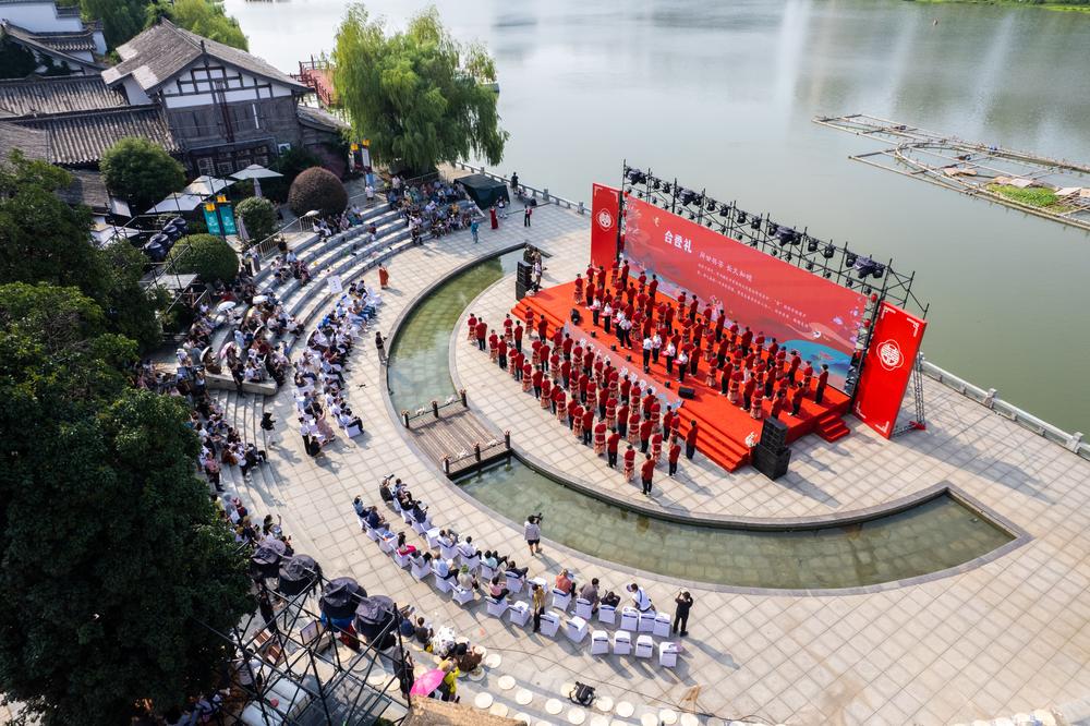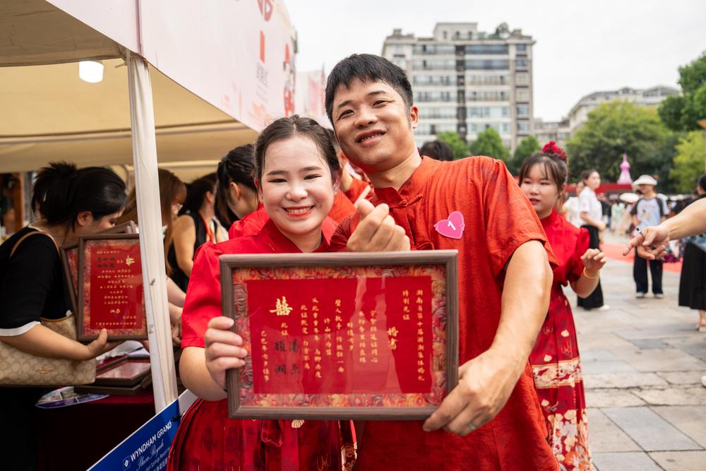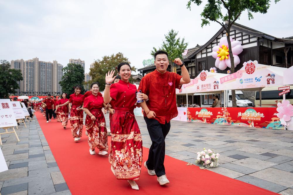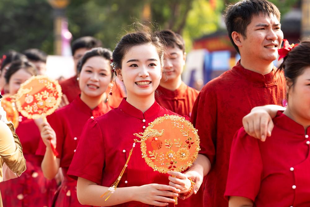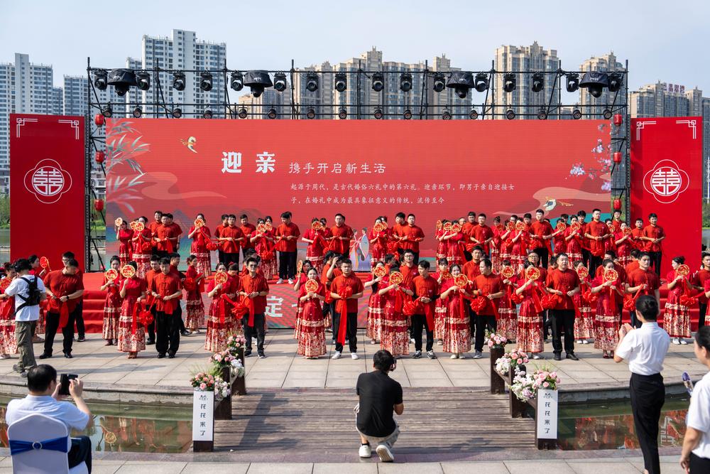 8月30日,湖南省第十届国潮集体婚礼在常德河街春秋广场举行,77对新人身着简约中式婚服,在喜庆浪漫的氛围中交换信物、许下爱的誓言,与家属代表共同见证这一幸福时刻。