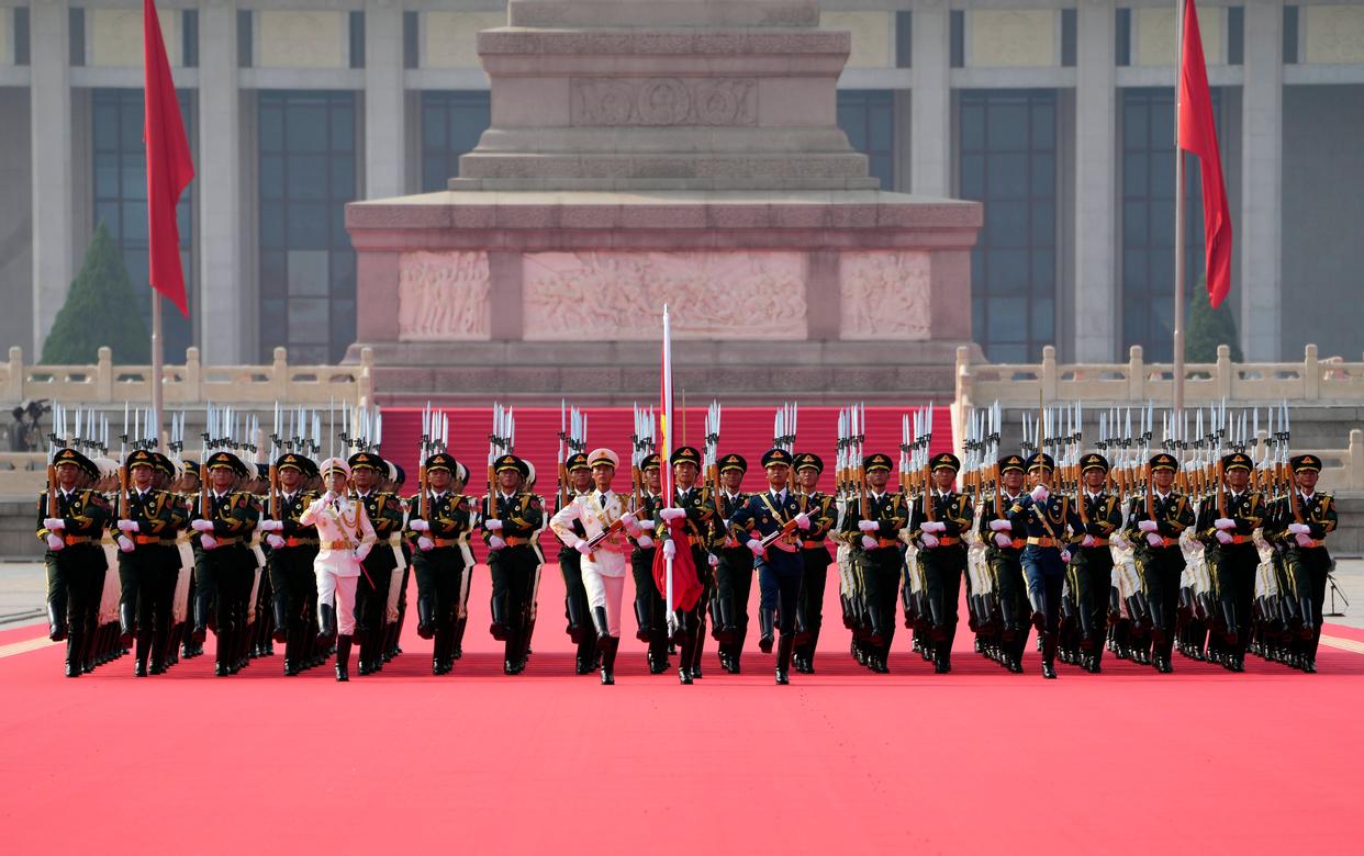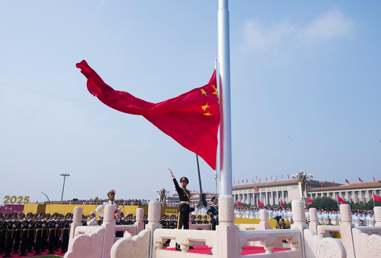 9月3日,纪念中国人民抗日战争暨世界反法西斯战争胜利80周年大会在北京隆重举行。这是国旗护卫队从人民英雄纪念碑基座出发,走向旗杆基座。