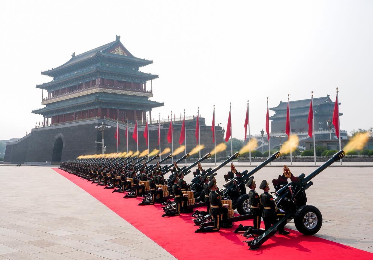 56门礼炮寓意着全国56个民族共同抗击日本侵略者艰苦卓绝的斗争,80响鸣放寓意着中国人民抗日战争暨世界反法西斯战争胜利80周年。