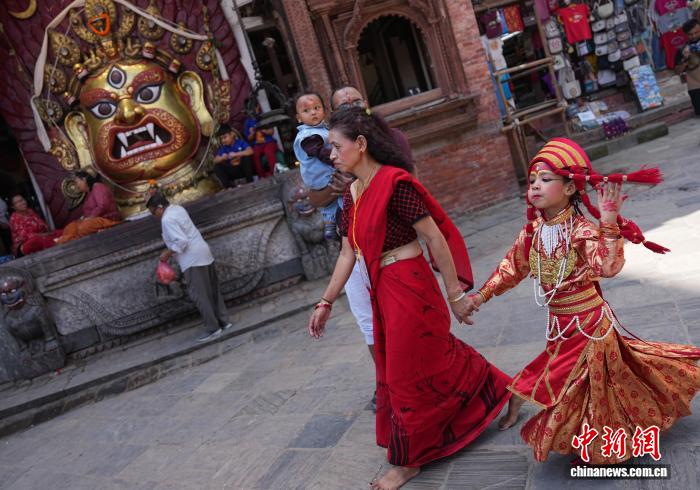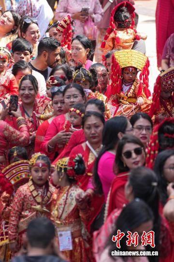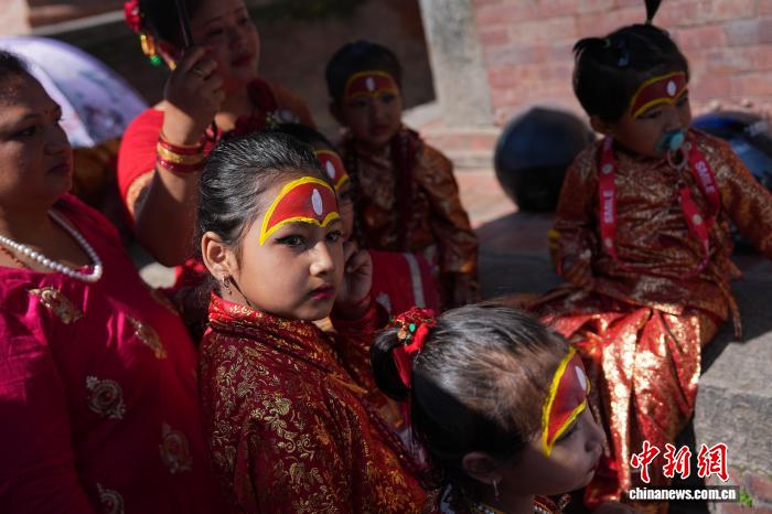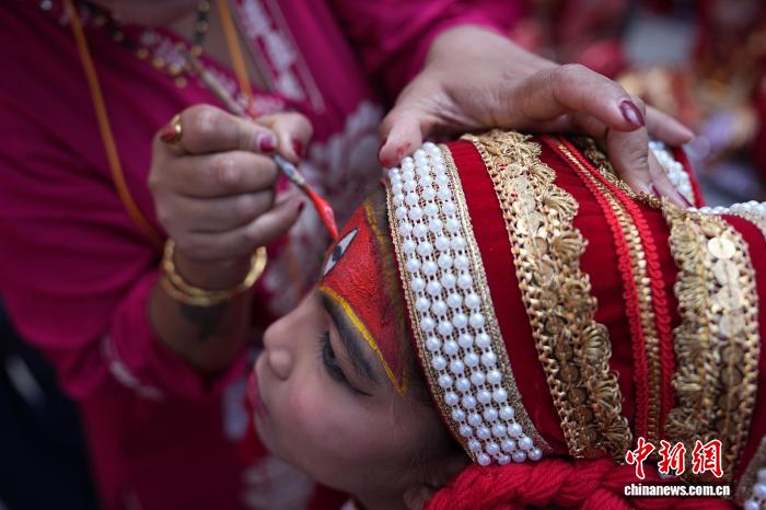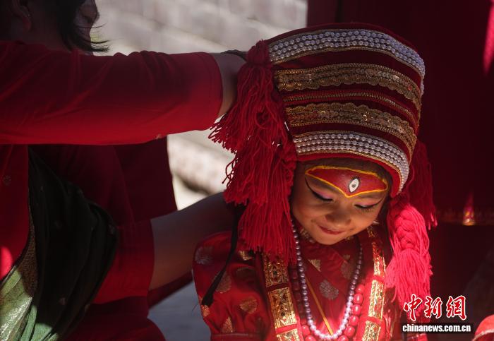 图为扮成“库玛丽活女神”的尼泊尔女孩。 中新社记者崔楠摄