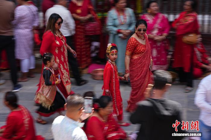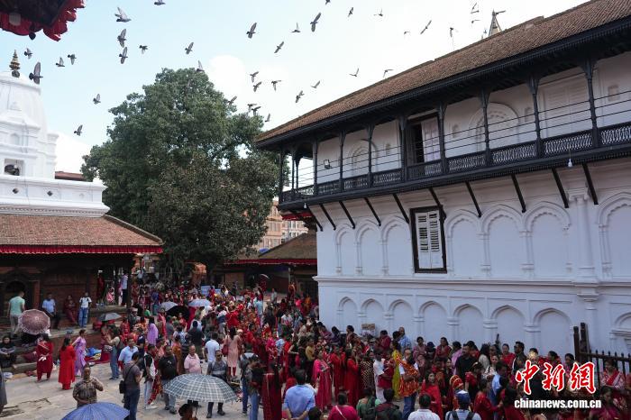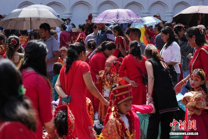9月5日,因陀罗节期间,数百名尼泊尔小女孩装扮成“库玛丽活女神”,聚集在加德满都杜巴广场参加库玛丽祭拜(KumariPuja)活动。这是尼泊尔一项传统活动,当地人认为祭拜可以保佑女孩在来年免受疾病和厄运侵扰。 中新社记者崔楠摄