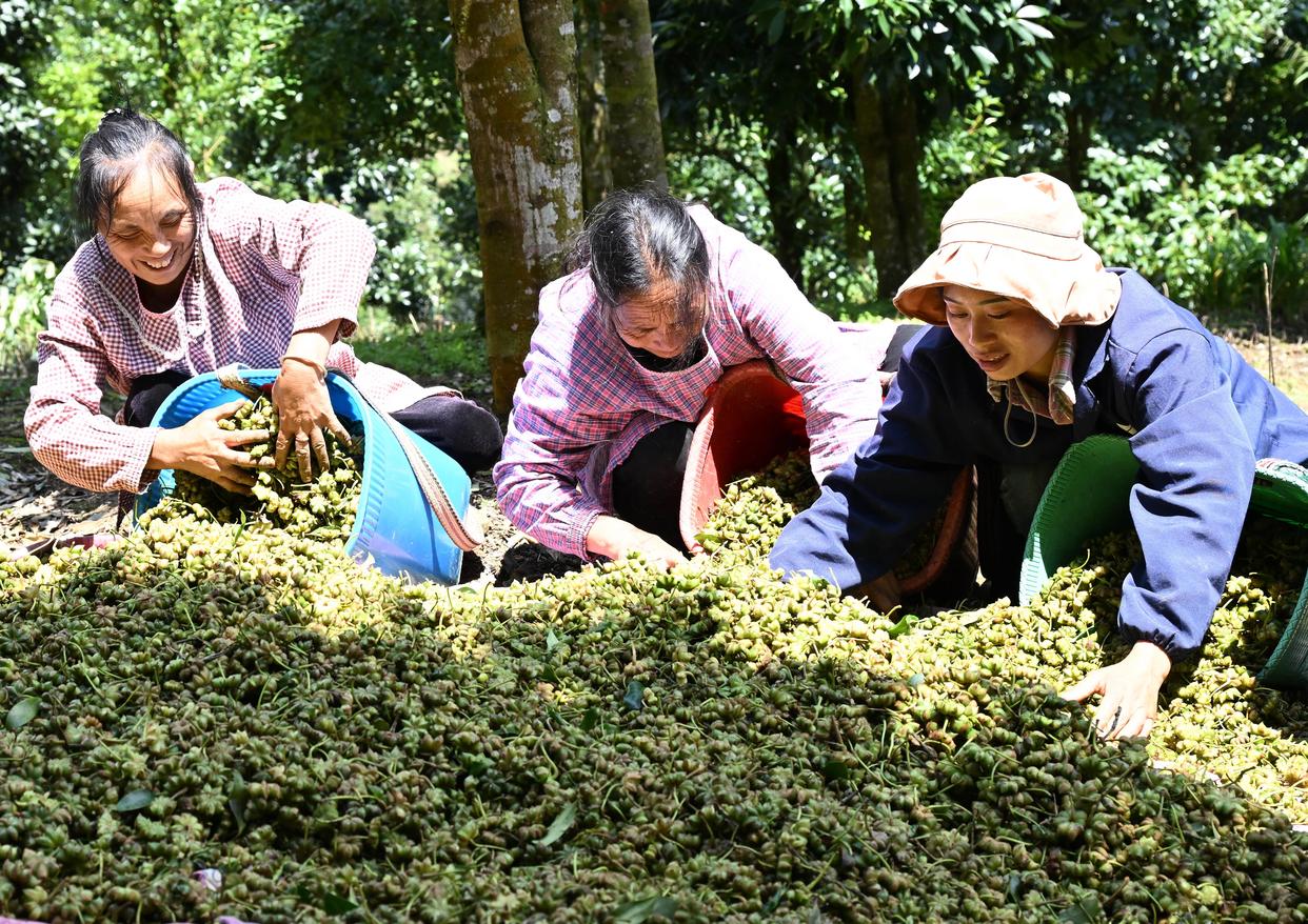 9月22日,云南省文山壮族苗族自治州马关县木厂镇老房子村的农民在分选刚摘下的八角。新华社发(熊平祥摄)