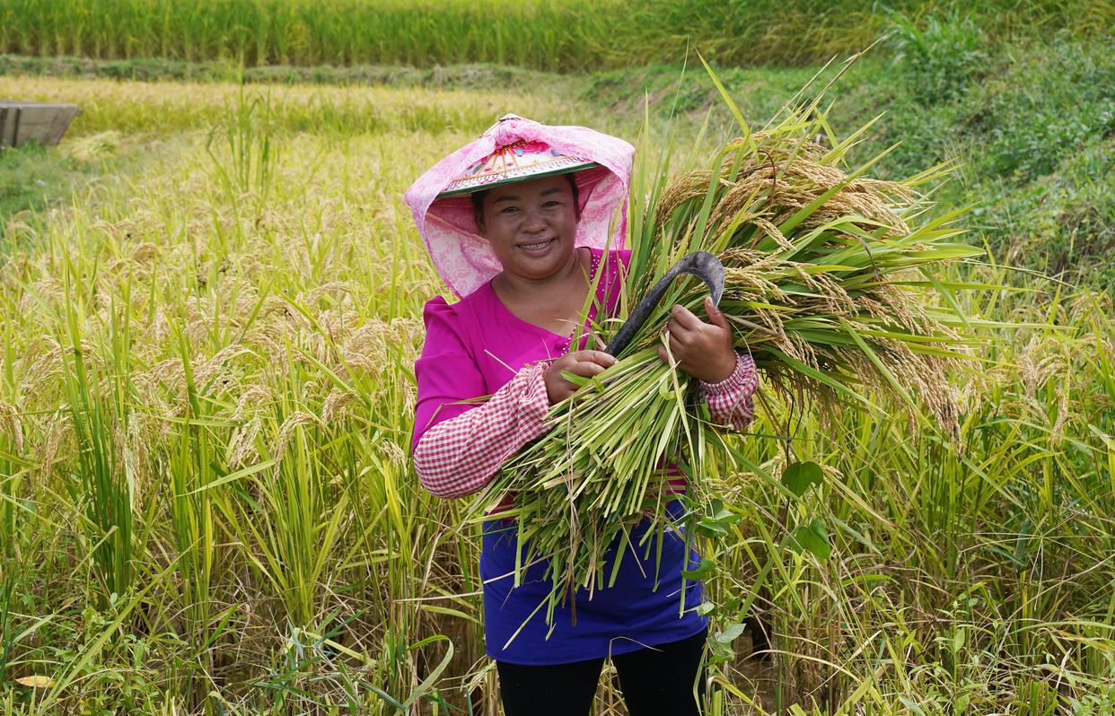 9月22日,在云南省德宏傣族景颇族自治州芒市遮放贡米种植基地,村民展示收获的稻谷。新华社发(梁志强摄)