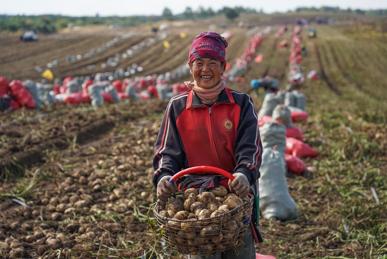 9月22日,河北省承德市围场满族蒙古族自治县御道口镇农民在田间展示收获的马铃薯。新华社发(刘满仓摄)