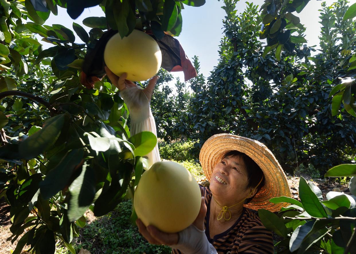 9月22日,在福建省平和县,果农在柚子园里采摘蜜柚。新华社发(李润南摄)