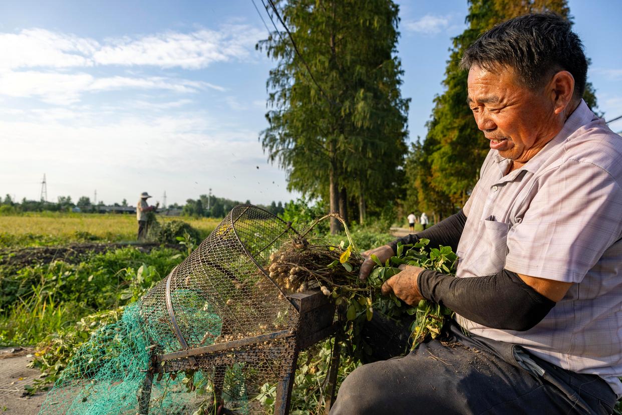 9月22日,在江苏省泰州市海陵区红旗街道国家农业产业园,农民在采摘花生。新华社发(汤德宏摄)