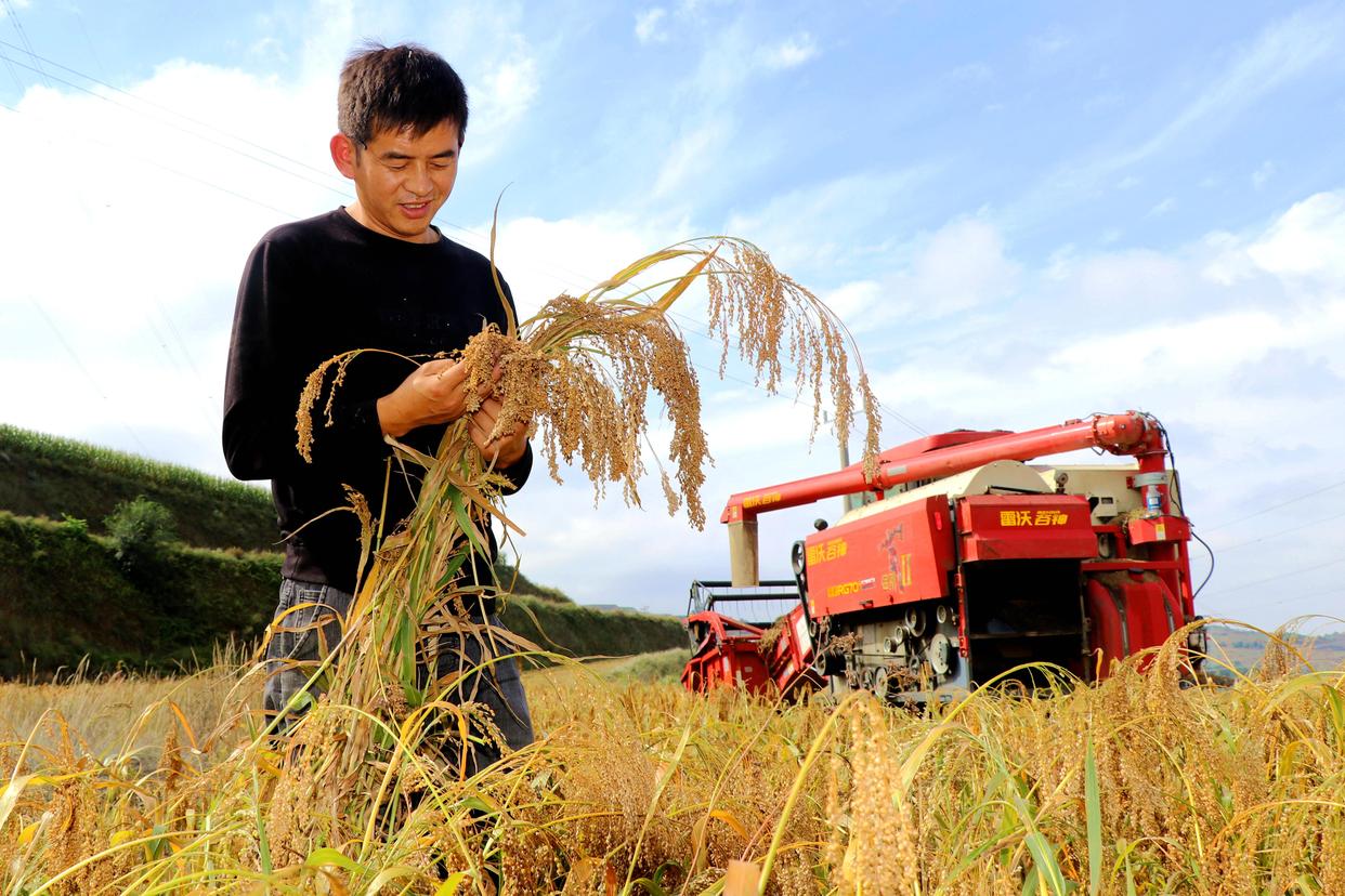 9月22日,在甘肃省平凉市静宁县城川镇咀头村,村民查看糜子生长情况。新华社发(王毅摄)
