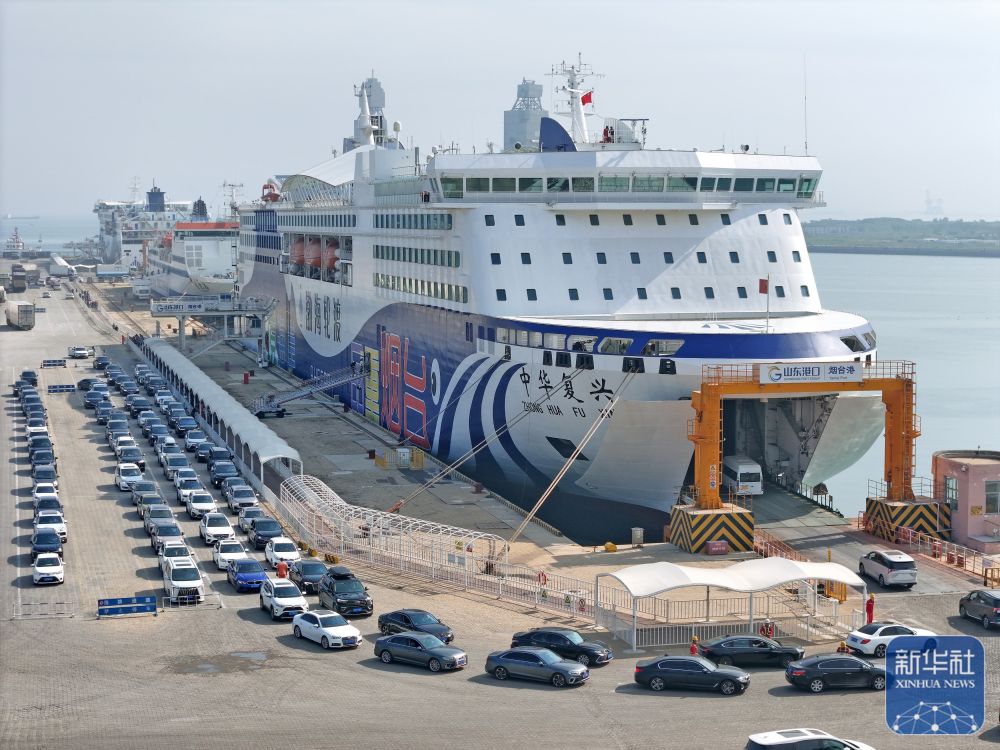 ↑ 9月30日,在山东港口烟台港,车辆驶入烟台至大连的客滚船(无人机照片)。新华社发(唐克 摄)
