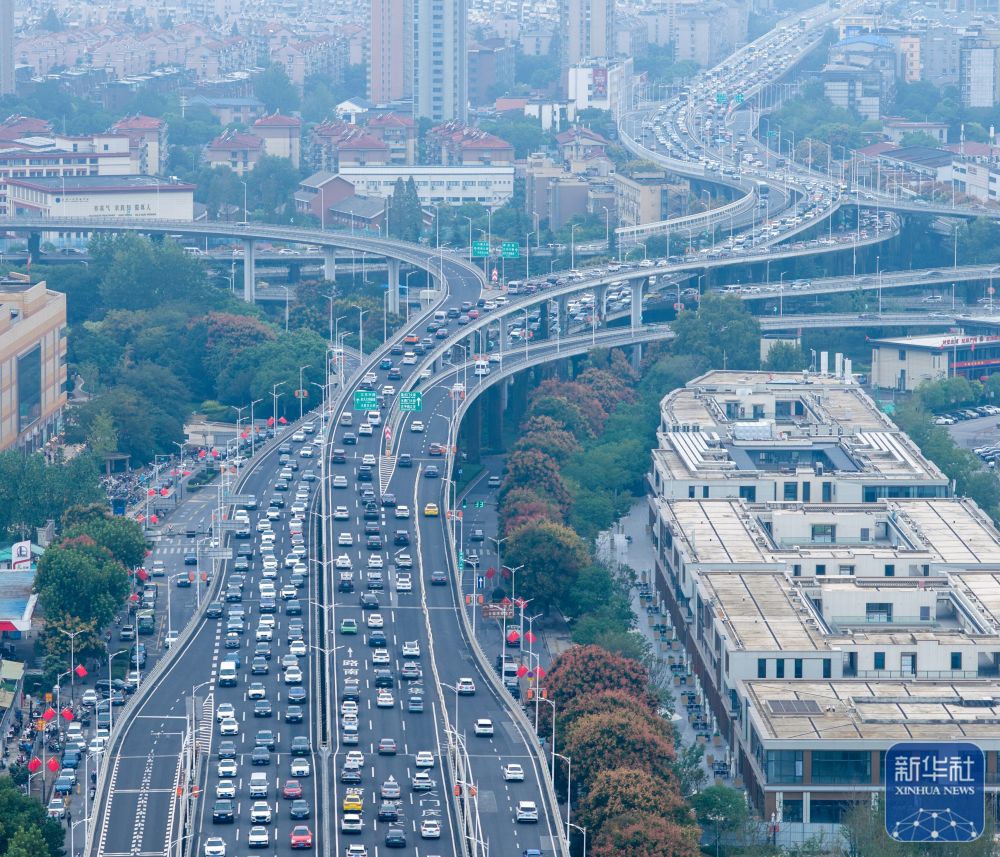 ↑ 9月30日在南京应天高架上拍摄的出行车流(无人机照片)。新华社发(杨素平 摄)