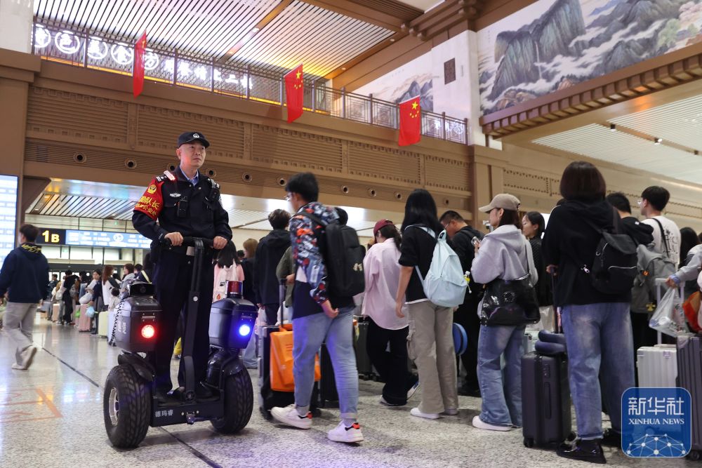 ↑ 9月30日,西安铁路公安局西安公安处西安站派出所民警在西安站候车大厅执勤巡逻。新华社发(张鑫 摄)