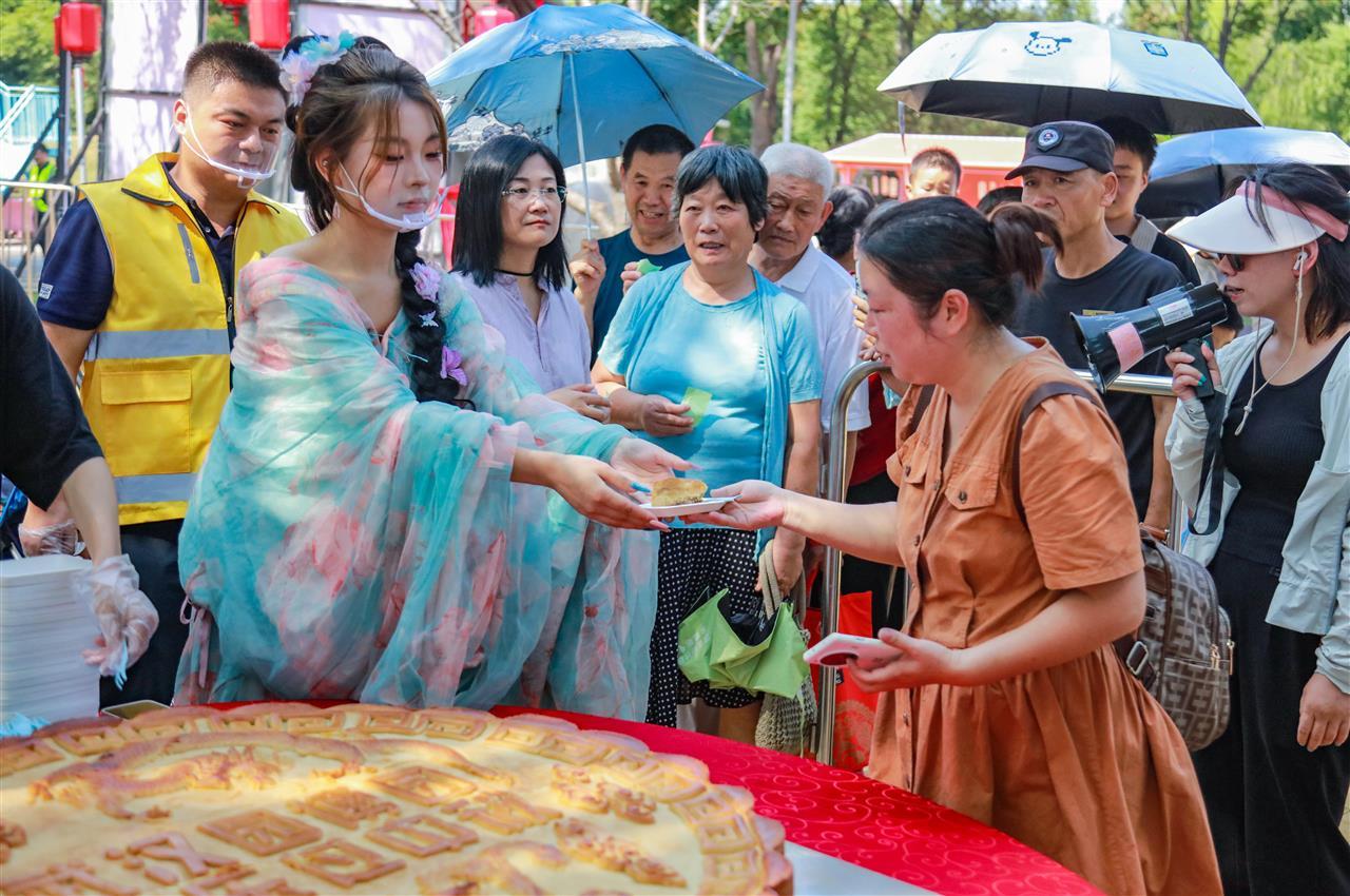 这个中秋节,武汉园博园举办“望月、奔月、赏月、品月”等中秋游园系列活动。邀请游客免费品尝大月饼,是公园举行的品月活动。