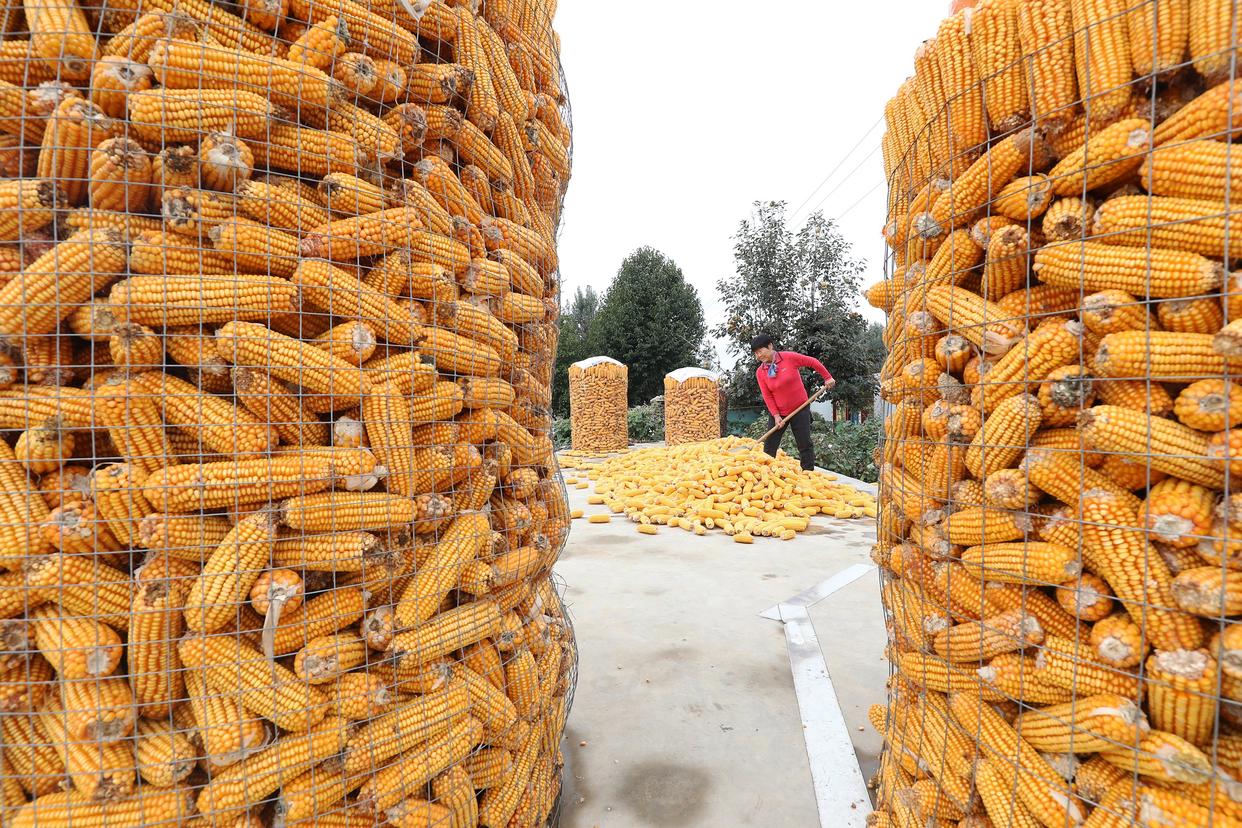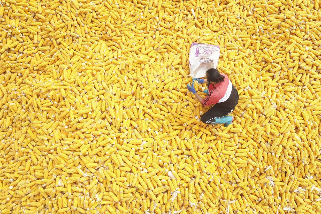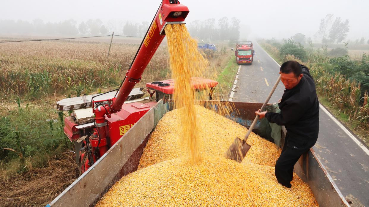 10月11日,江苏省连云港市海州区岗埠农场工作人员在装运玉米。新华社发(耿玉和摄)