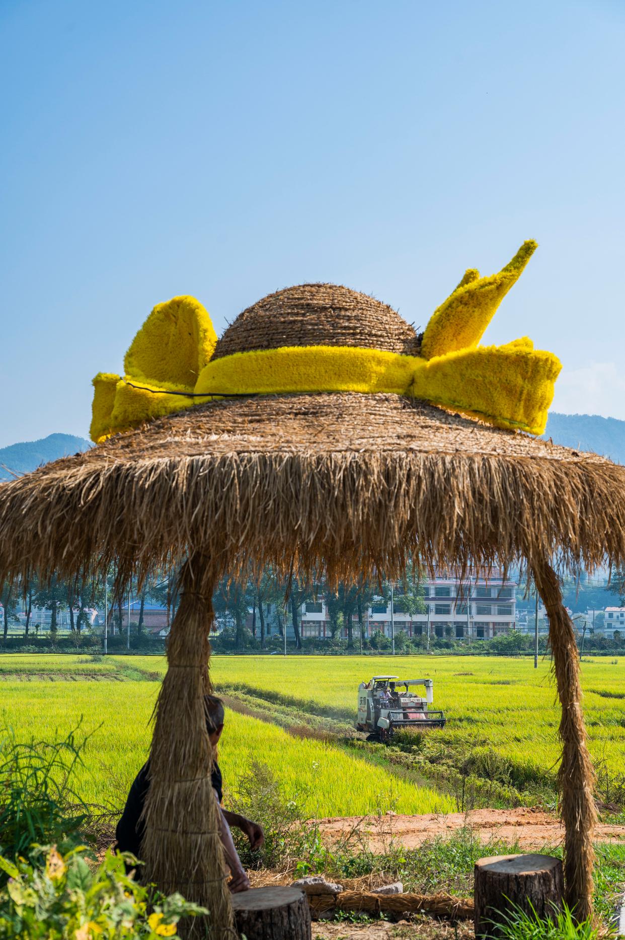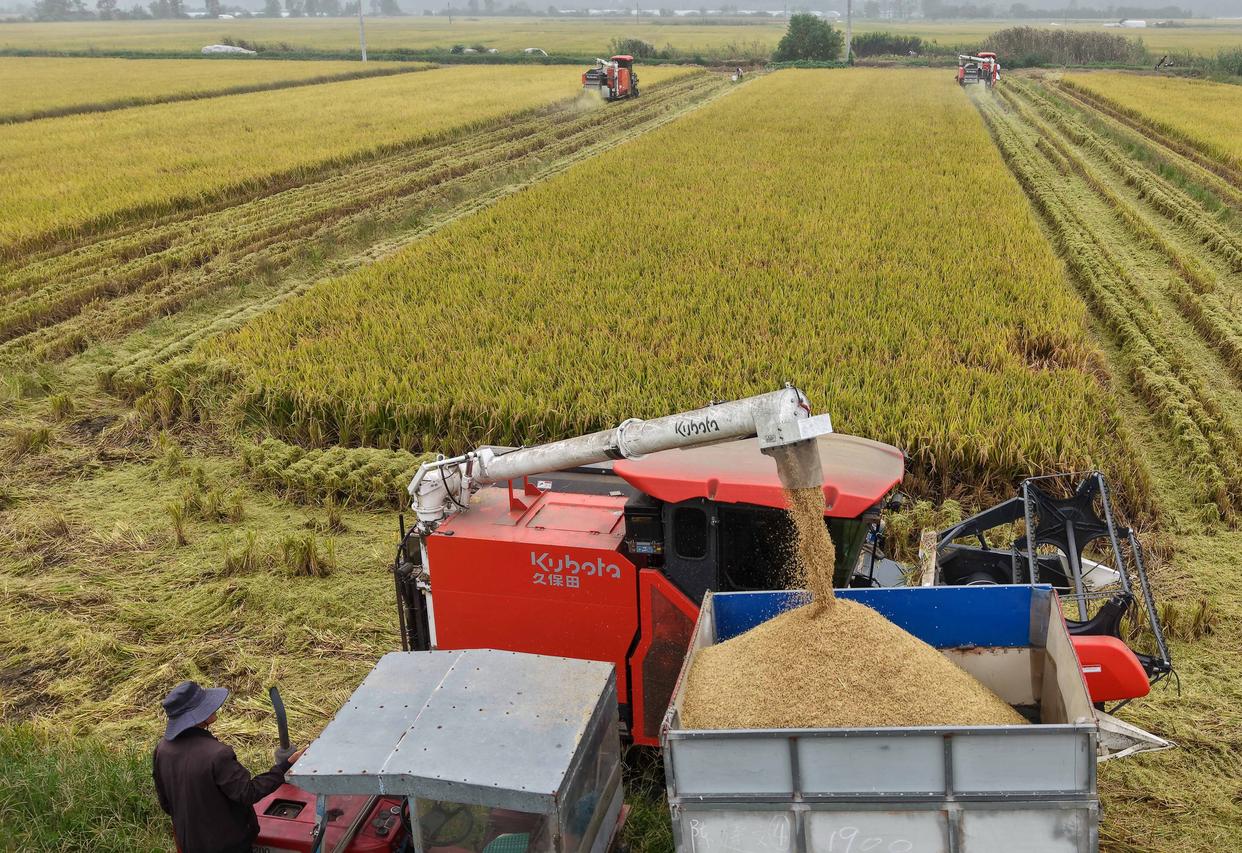 10月11日,湖南省娄底市双峰县荷叶镇清泉村农民驾驶收割机收获晚稻。新华社发(李建新摄)