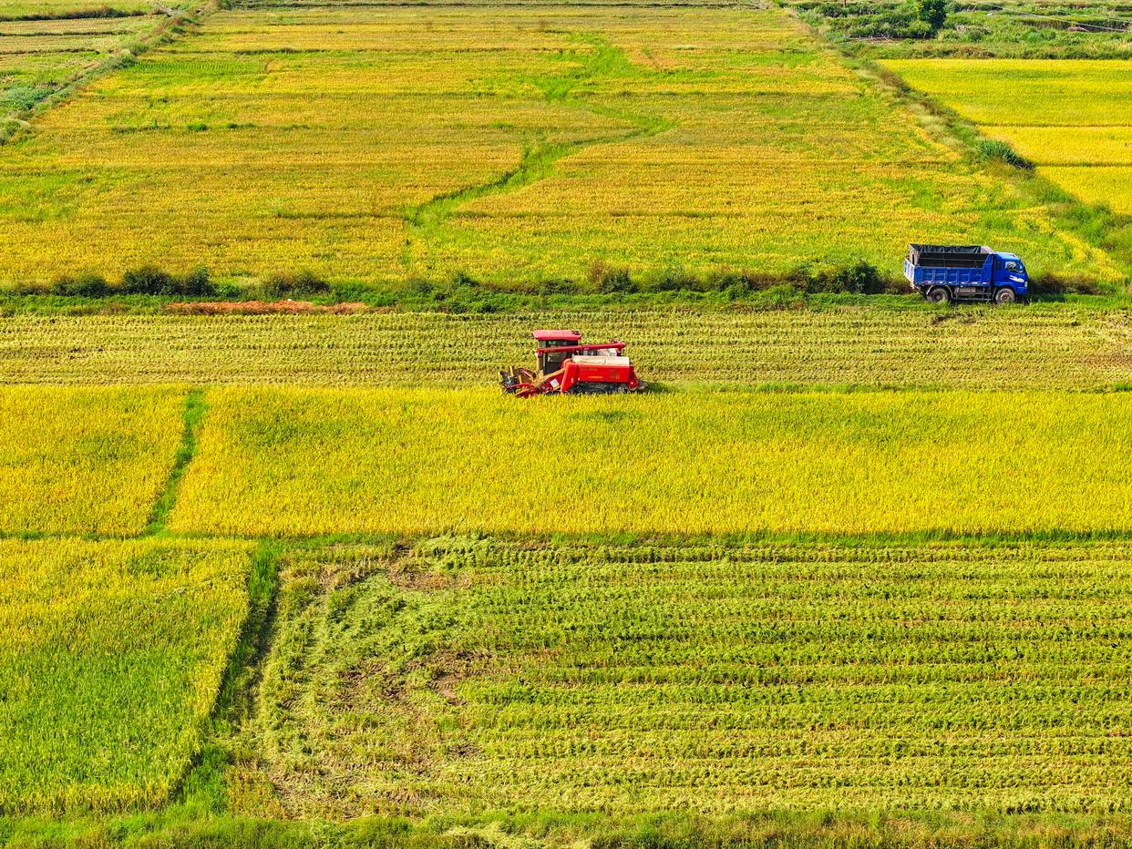 10月11日,湖南省衡阳市衡山县白果镇村民驾驶农机收割稻谷(无人机照片)。新华社发(曹正平摄)