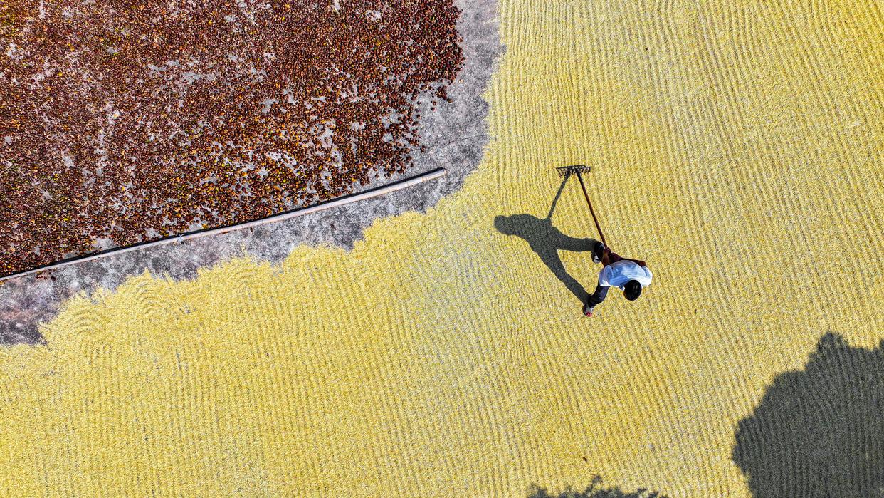 10月11日,湖南省常宁市兰江乡农民在晾晒稻谷(无人机照片)。新华社发(周秀鱼春摄)