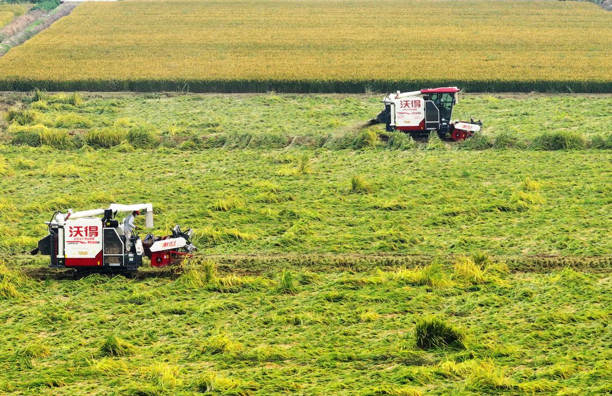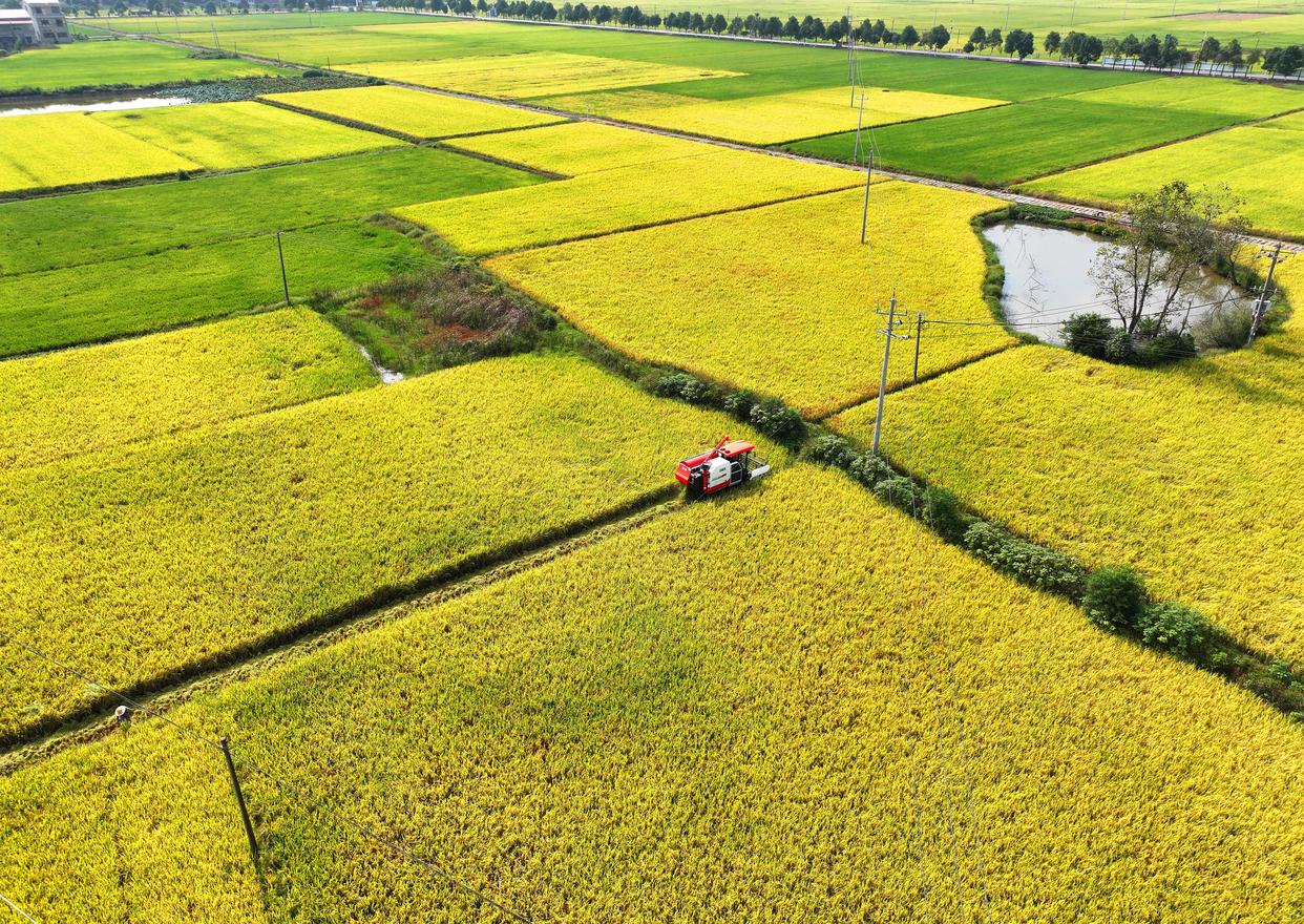 10月11日,在江苏省扬州市邗江区公道镇,农民驾驶农机收割水稻(无人机照片)。新华社发(孟德龙摄)