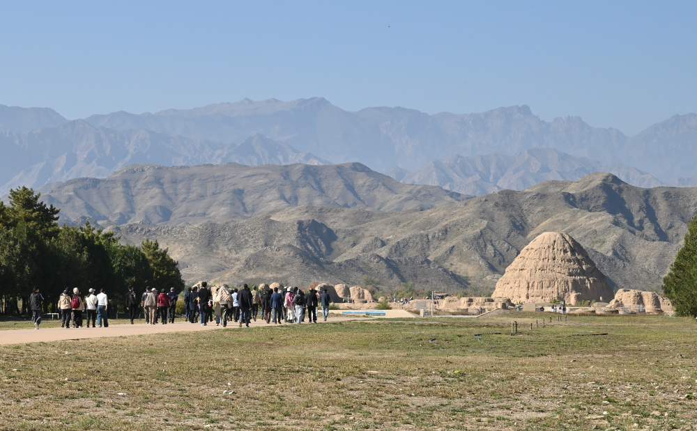与会专家学者在宁夏银川西夏陵遗址进行学术考察(10月13日摄)。新华社记者 李贺 摄