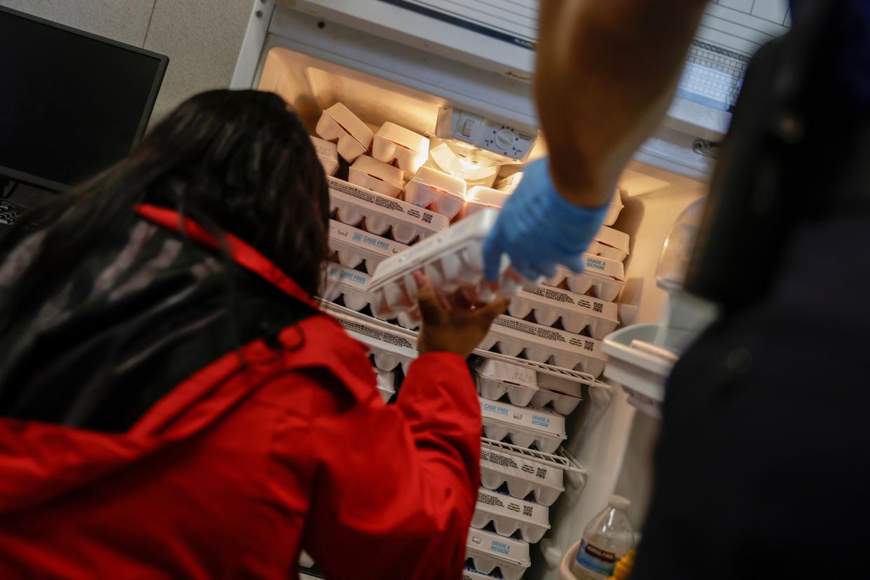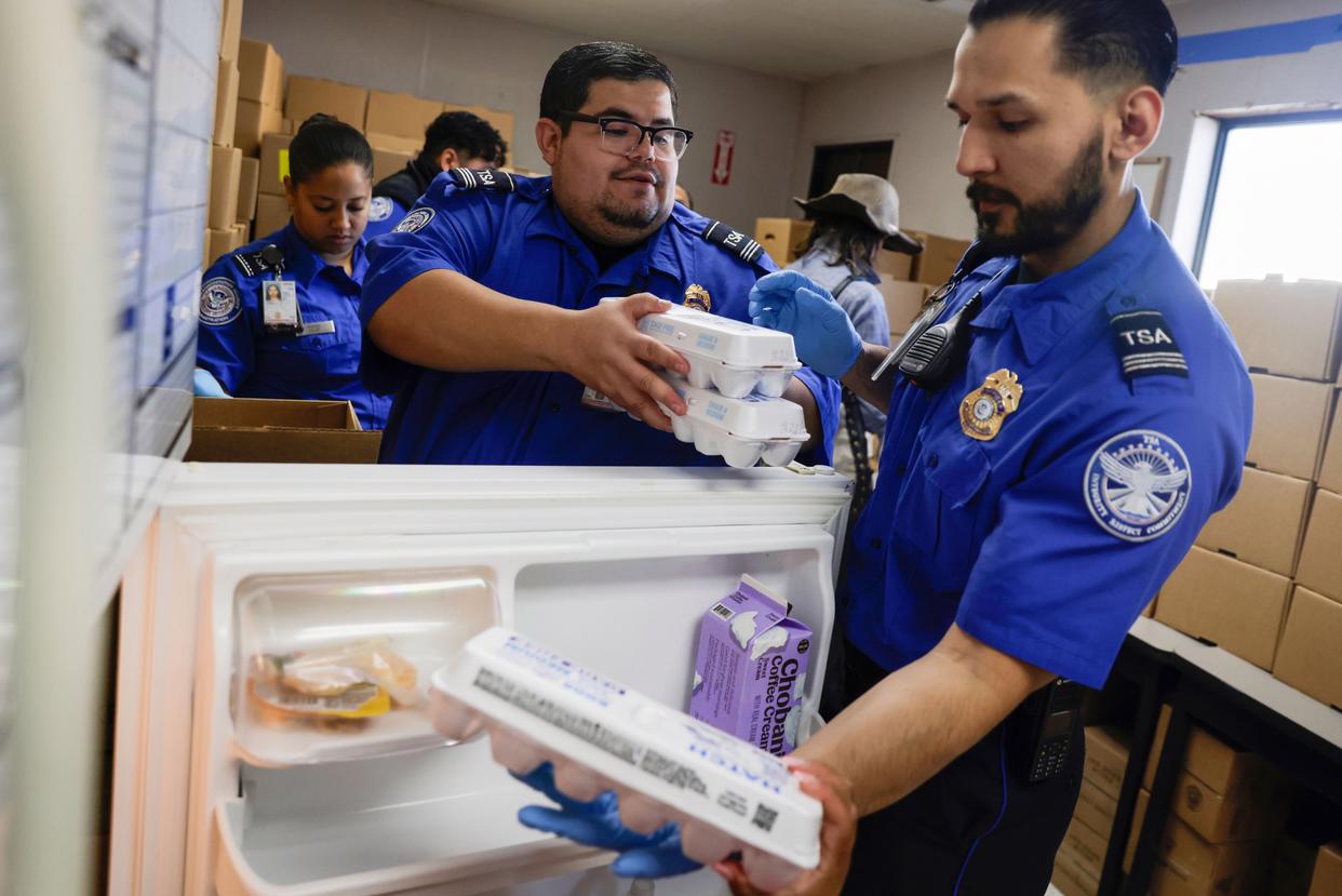 10月16日,在美国奥克兰国际机场,美国运输安全管理局的工作人员将领取的免费鸡蛋放入冰箱。新华社/美联