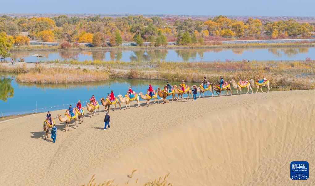 10月18日,游客在新疆巴音郭楞蒙古自治州尉犁县罗布人村寨景区东沙山体验骆驼骑行(无人机照片)。