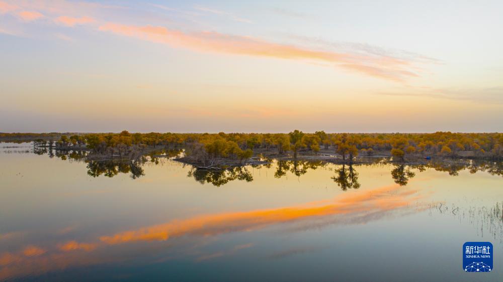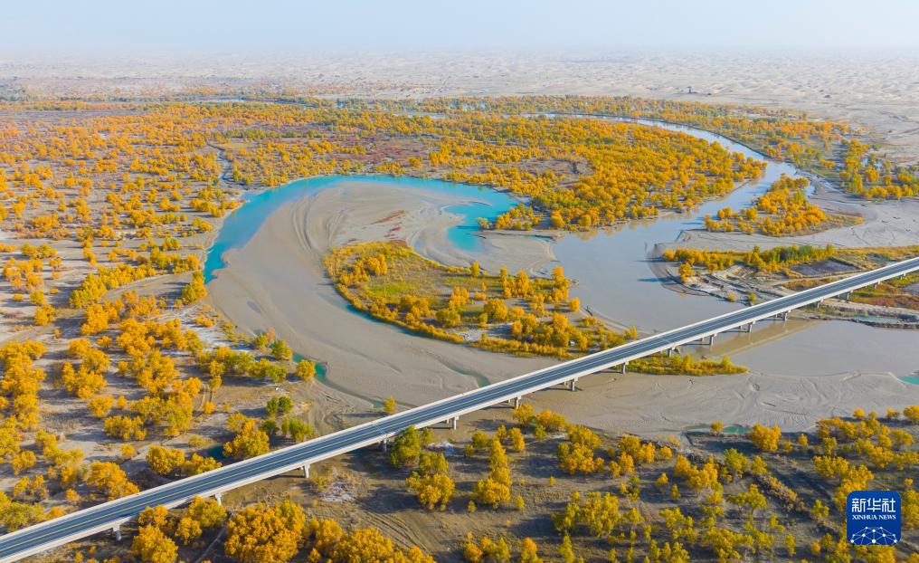 金秋时节,新疆巴音郭楞蒙古自治州尉犁县境内的沙漠胡杨景观与塔里木河互相映衬,美不胜收,吸引不少游客观光游览。