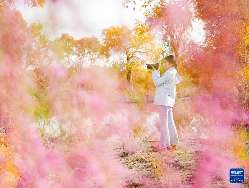 10月13日,游客在新疆巴音郭楞蒙古自治州尉犁县一处胡杨林中拍照打卡。