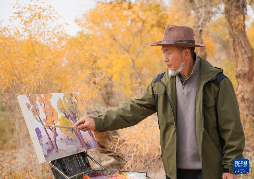 10月13日,绘画爱好者在新疆巴音郭楞蒙古自治州尉犁县一处胡杨林中写生。