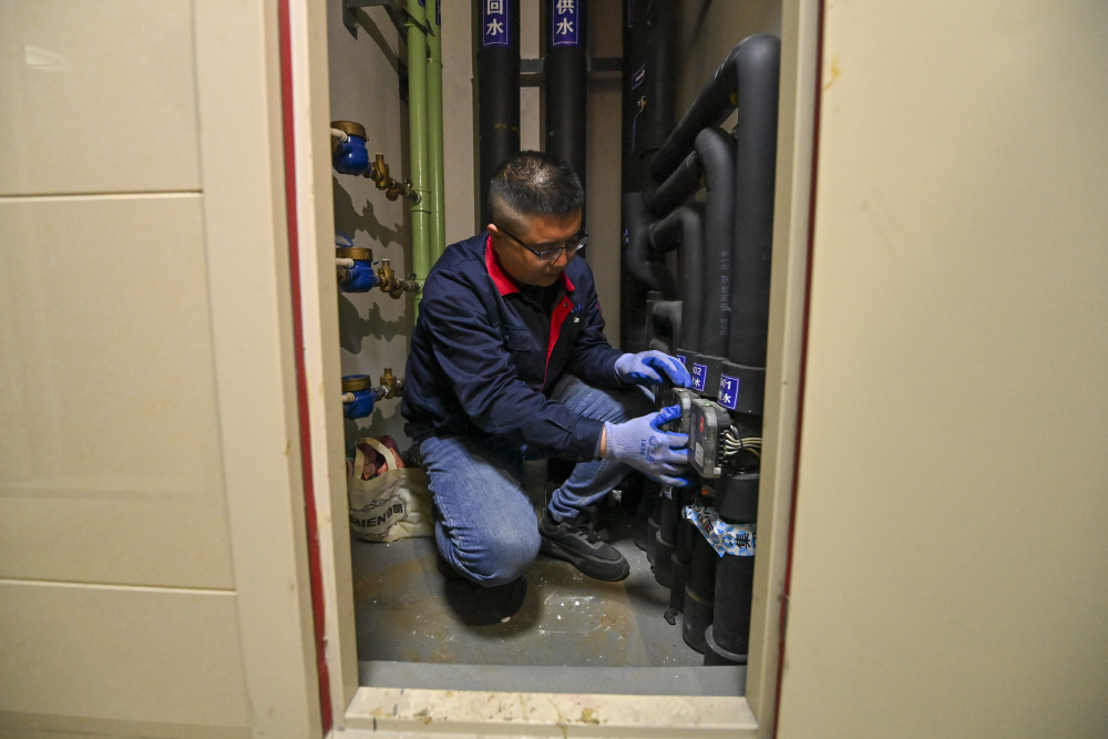 10月20日,在太原市万柏林区一小区,工作人员在楼道供热管井间内检查分户流量情况。新华社记者 杨晨光 摄
