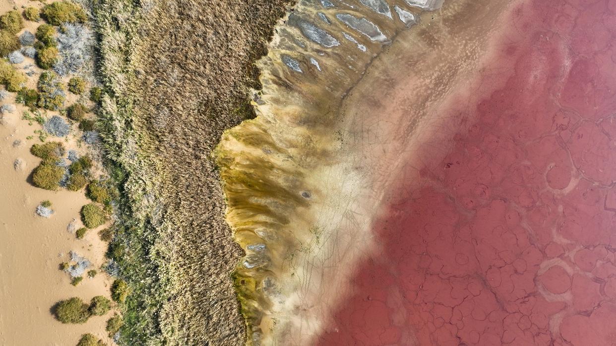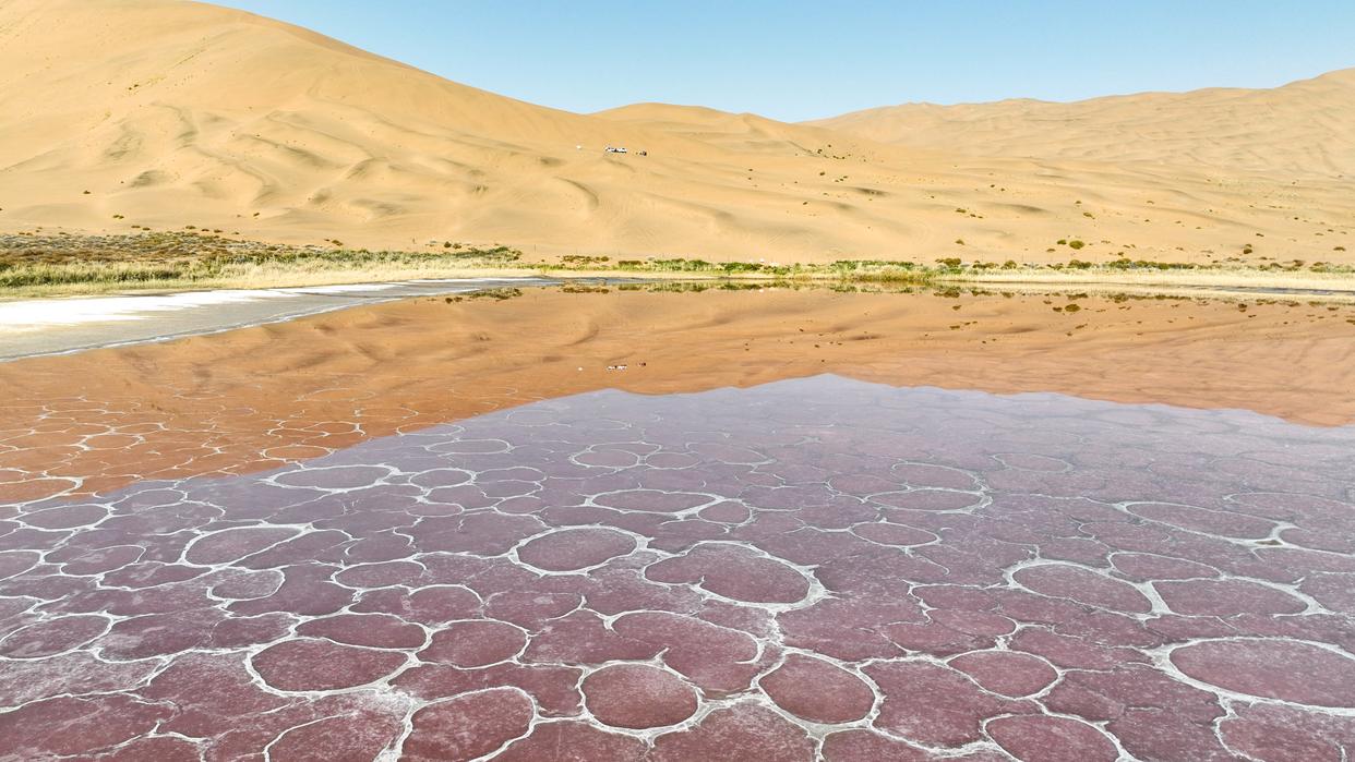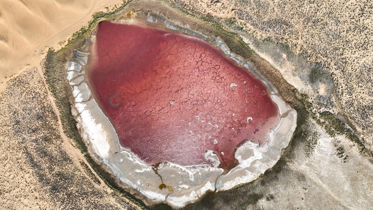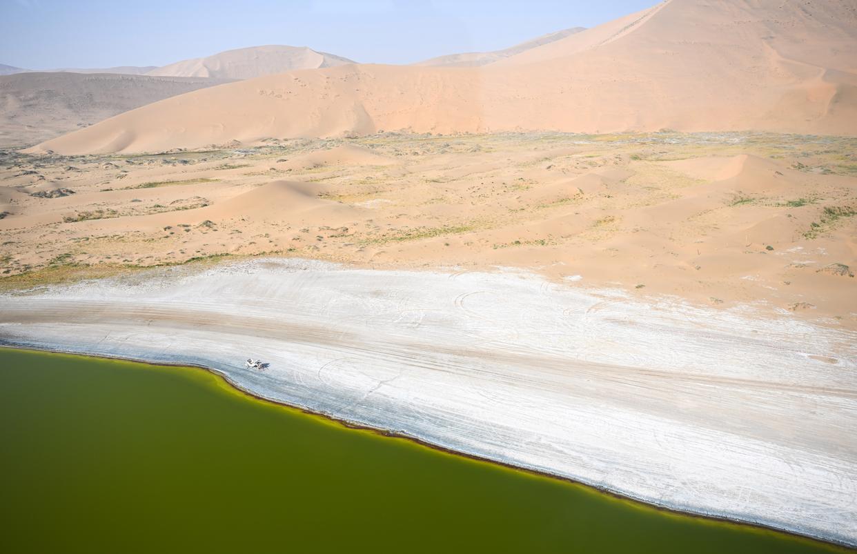 10月22日拍摄的巴丹吉林沙漠中的红海子(无人机照片)。新华社记者 贝赫 摄