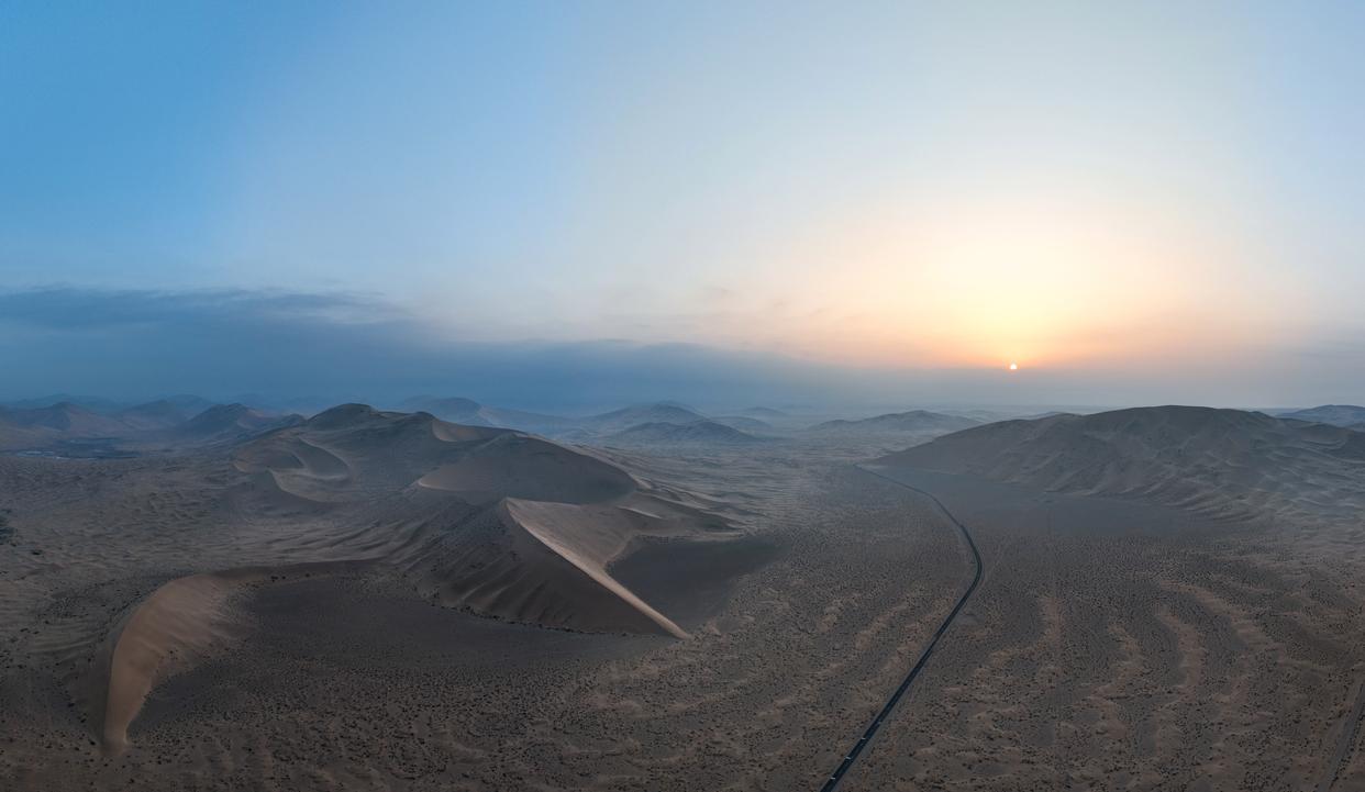 10月22日拍摄的巴丹吉林沙漠日出风光(无人机照片)。新华社记者 贝赫 摄
