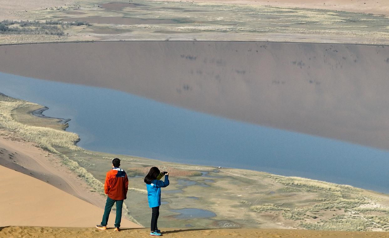 10月22日,游客在巴丹吉林沙漠拍照游玩(无人机照片)。新华社记者 贝赫 摄