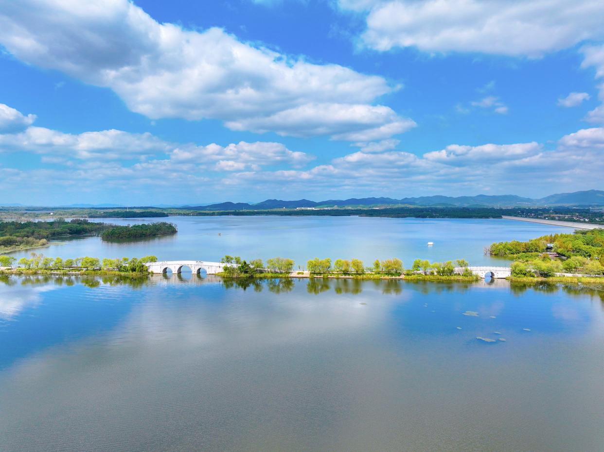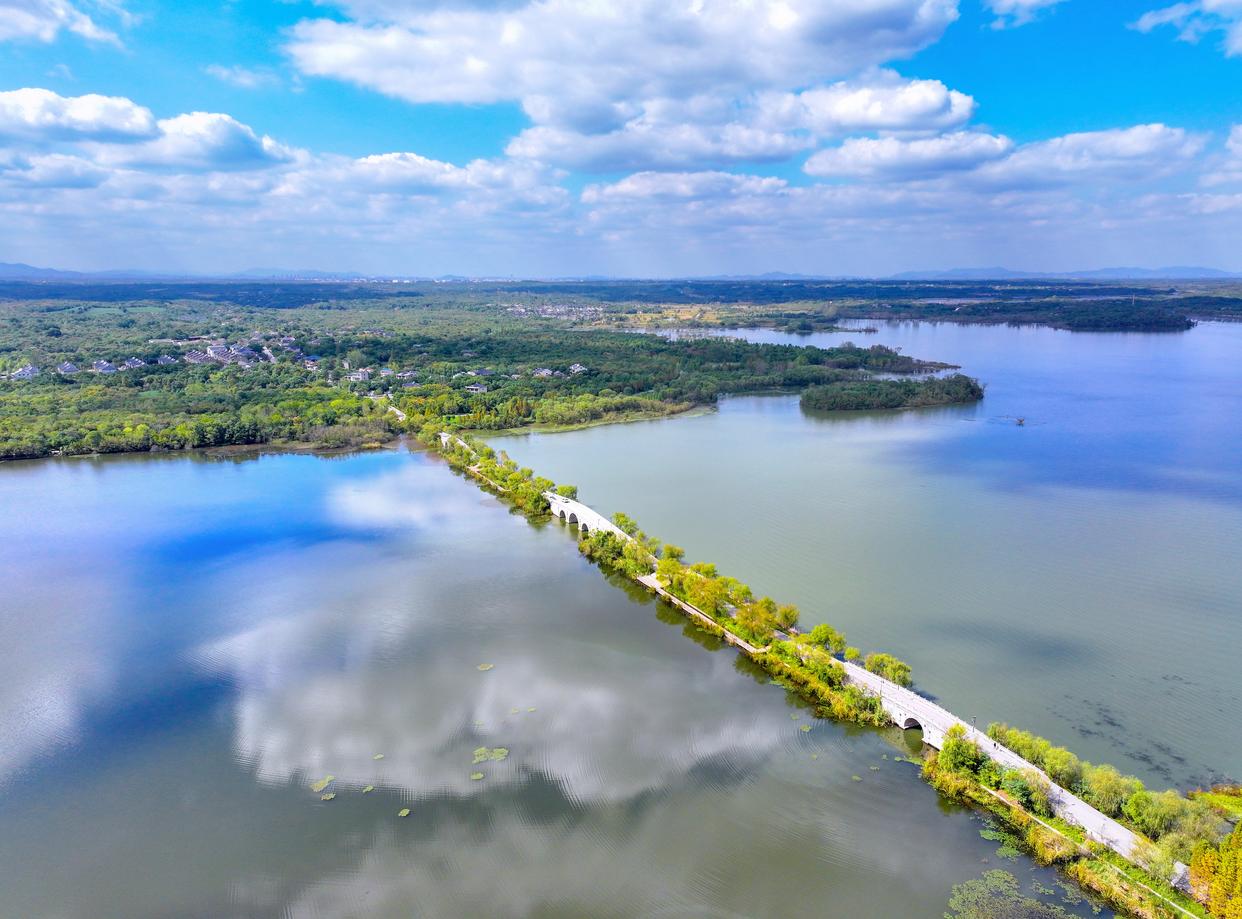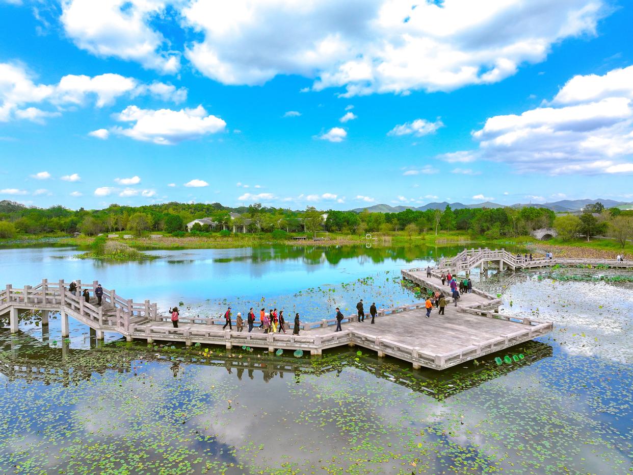 浙江省湖州市长兴县泗安镇仙山湖国家湿地公园风景宜人,游船行驶在湖面上,与蓝天、白云、小桥、游人相映成景,景美如画。